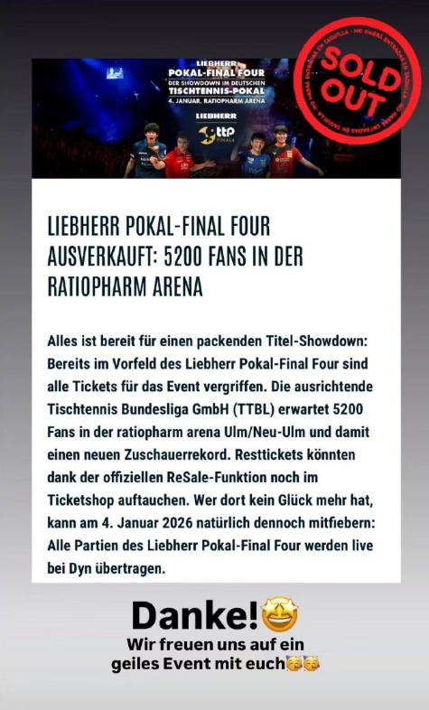 樊振东加盟德国杯门票创新纪录 2026年首赛,樊振东将和萨尔布吕肯俱乐部一起冲击德乒第一冠,德国杯(利勃海尔杯)决赛 【北京时间1月4号 18:00】🏓德国杯半决赛 萨尔布吕肯 VS 奥克森豪森 激动人心的冠军争夺战即将上演:利勃海尔杯决赛四强赛的所有门票均已售罄。 赛事组织方德国乒乓球联赛(TTBL) 预计将有5200名球迷涌入乌尔姆/新乌尔姆的Ratiopharm Arena,创下新的上座纪录。