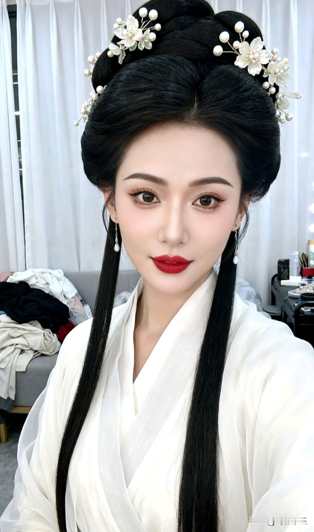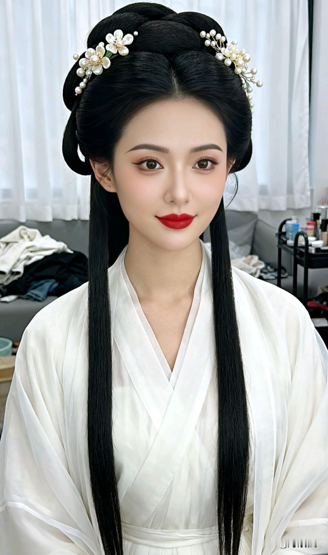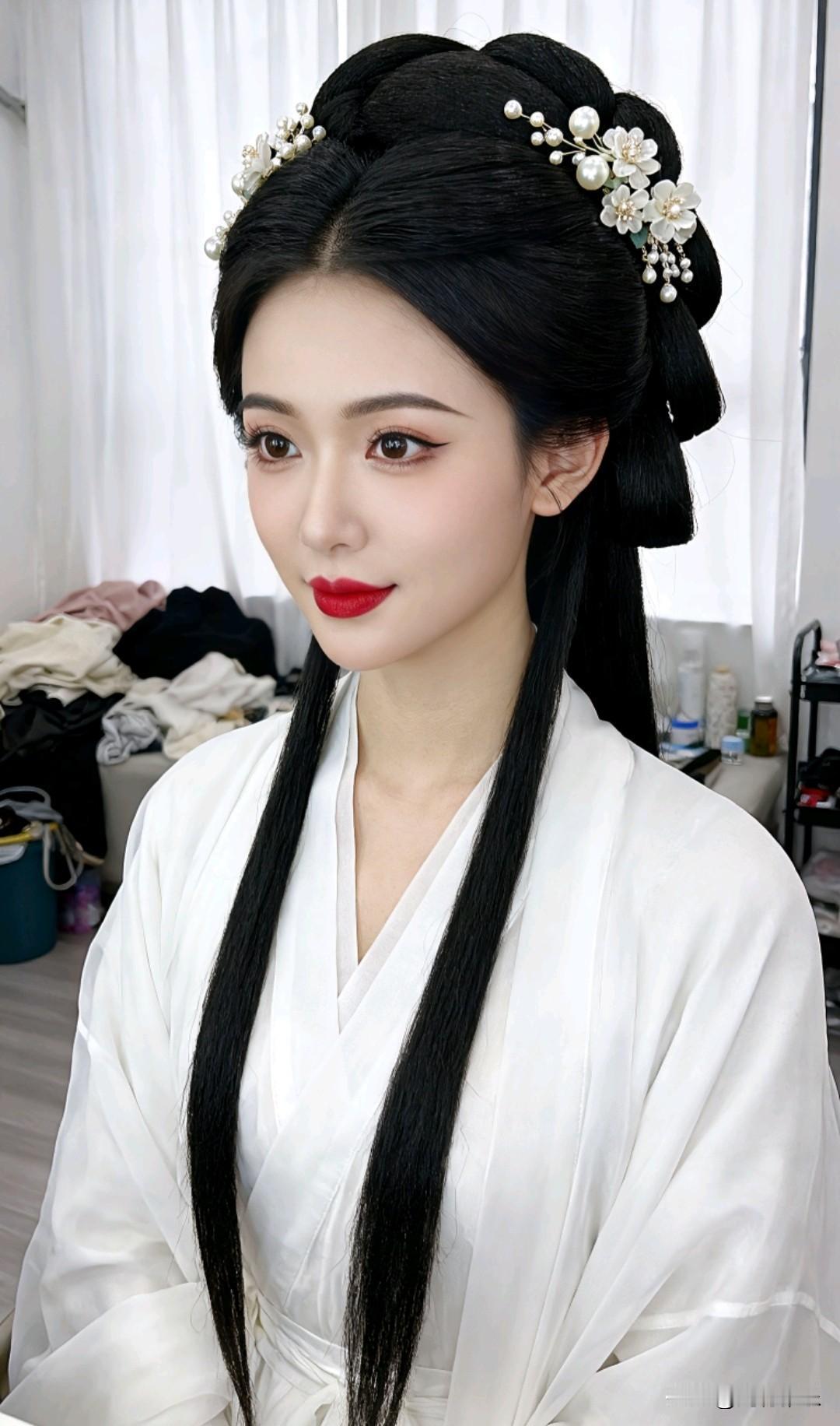 采用写实摄影的写真风格,一位女子身着一袭素雅且衣袂飘逸的白色汉服,尽显古典温婉气质。她那乌黑浓密的秀发精心梳成了典雅的古风发髻,一丝不乱,发髻上点缀着由珍珠与花朵造型组成的精致珠花发饰,为整体造型增添了灵动与柔美的感觉,耳畔两侧还垂落着修长的发辫,古韵十足。背景中是白色的窗帘,以及随意堆放着的一些衣物和物品,整个场景像是在一个用于准备或休息的房间内,营造出较为日常的氛围。女子妆容精致,眉眼如画,红唇点缀,与身上的传统服饰完美融合,将古典美学的韵味展现得淋漓尽致。图片风格为写真。