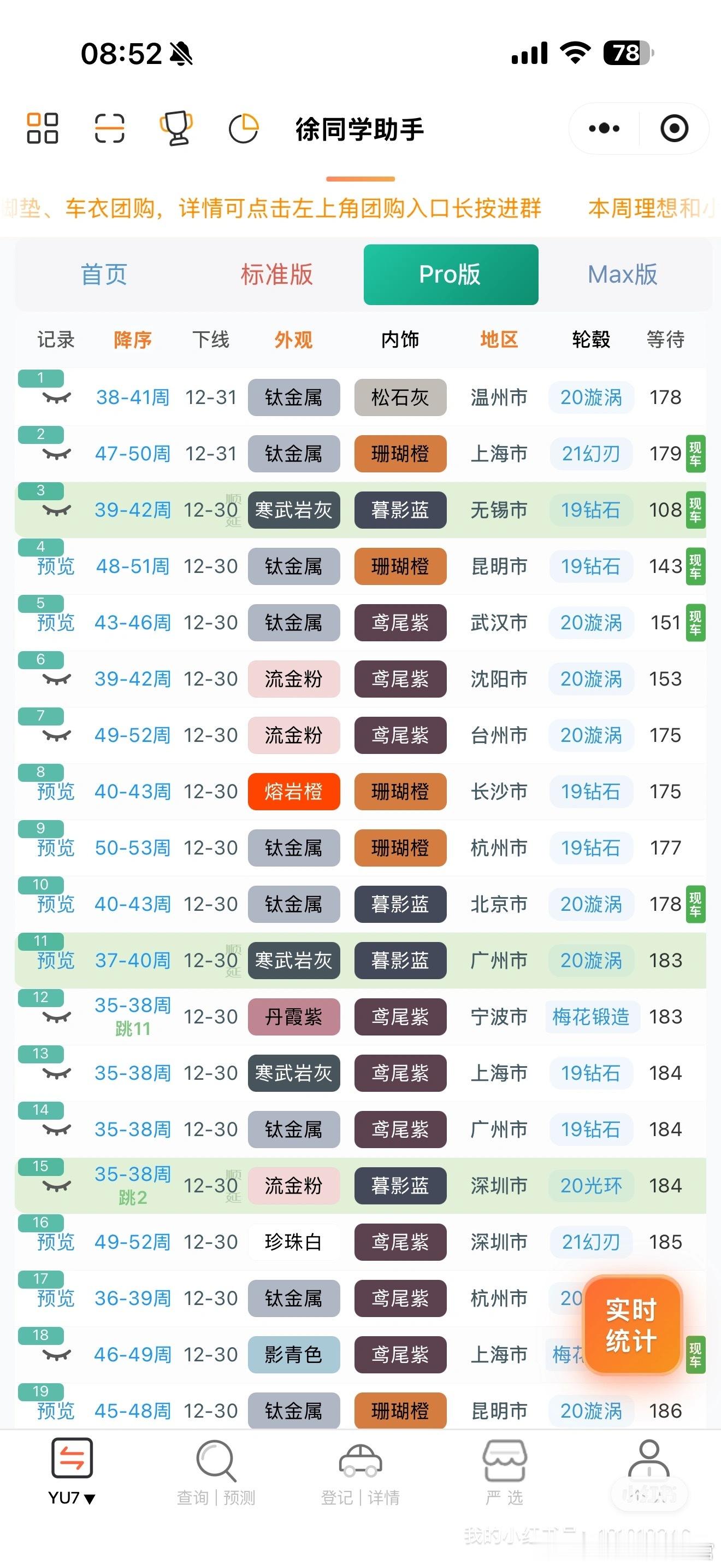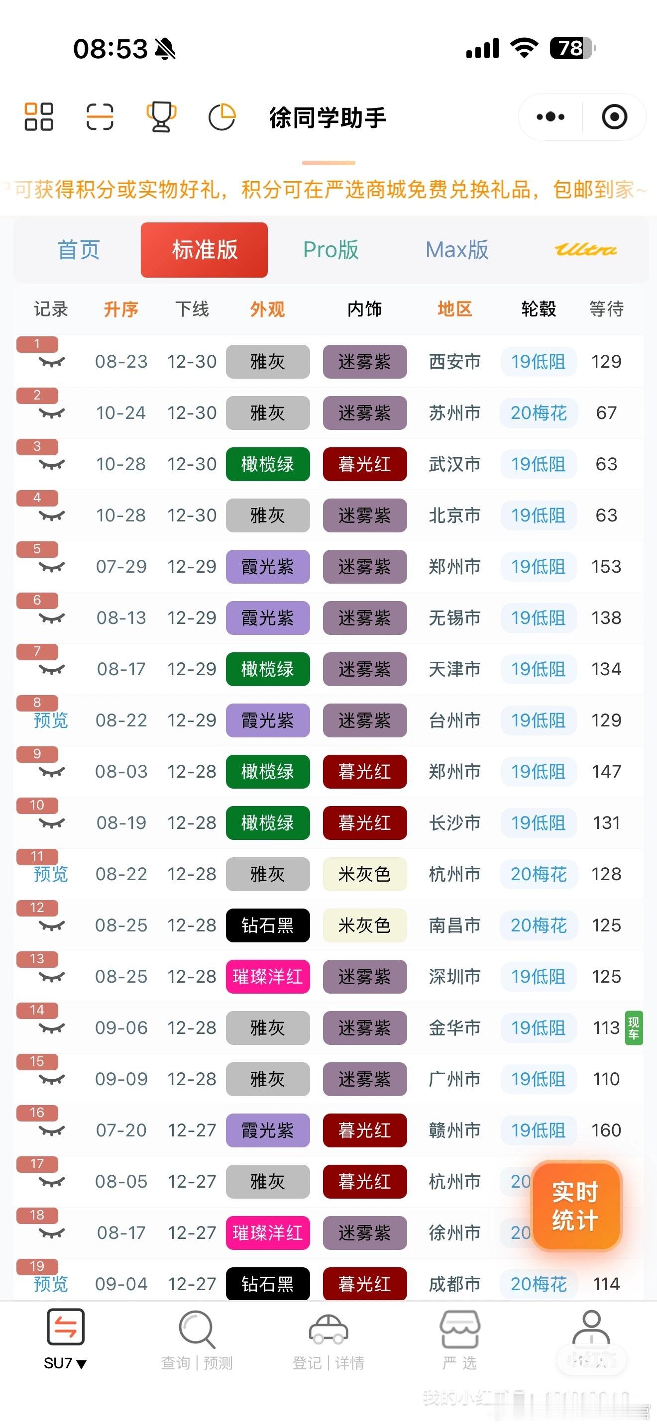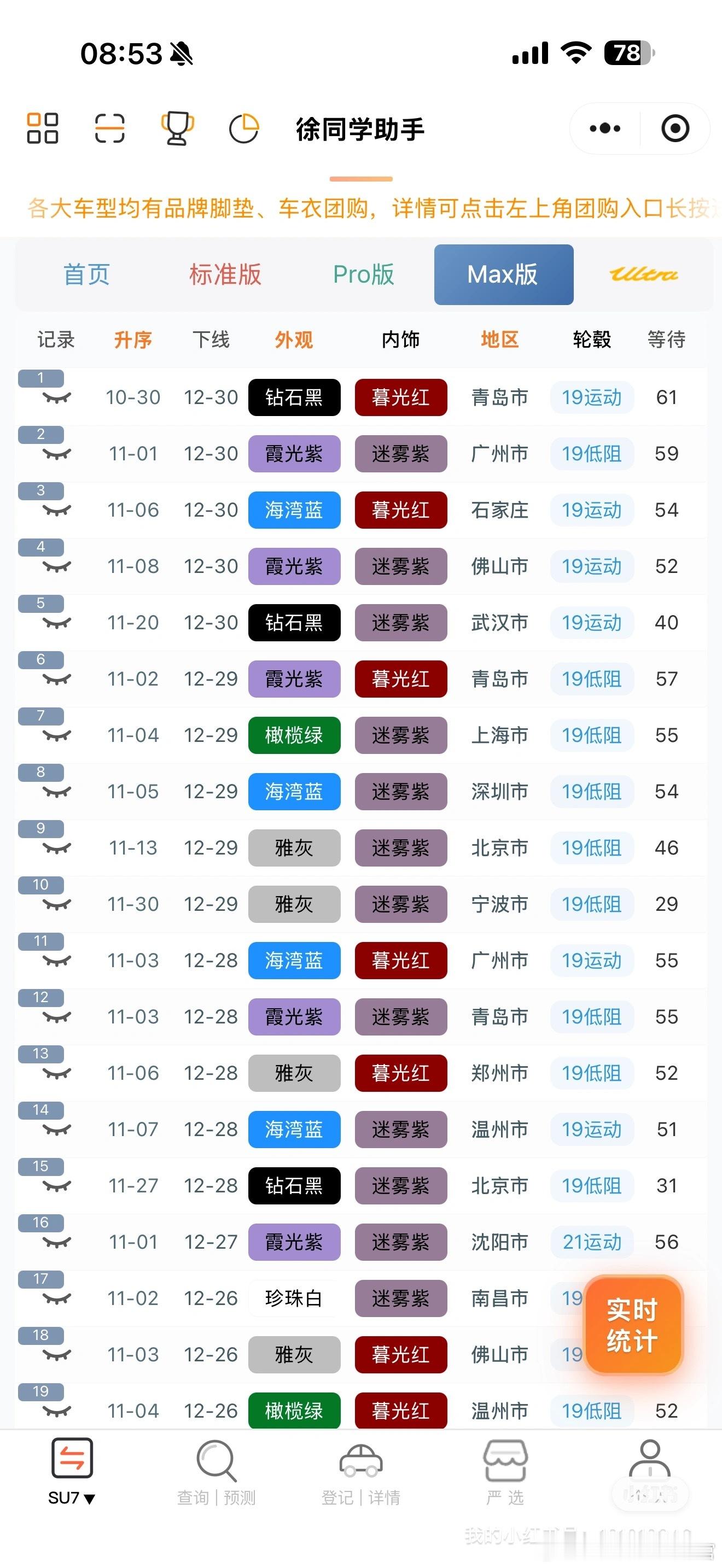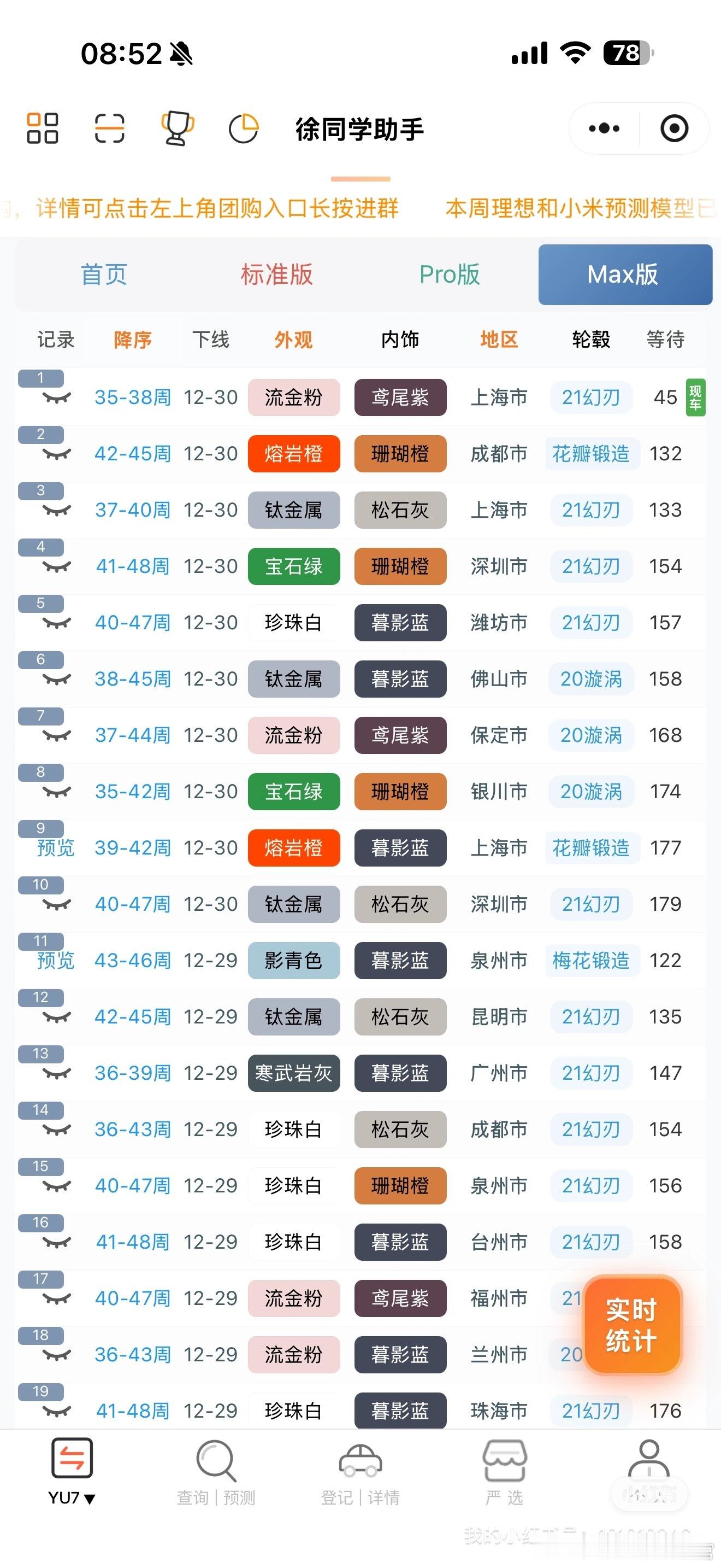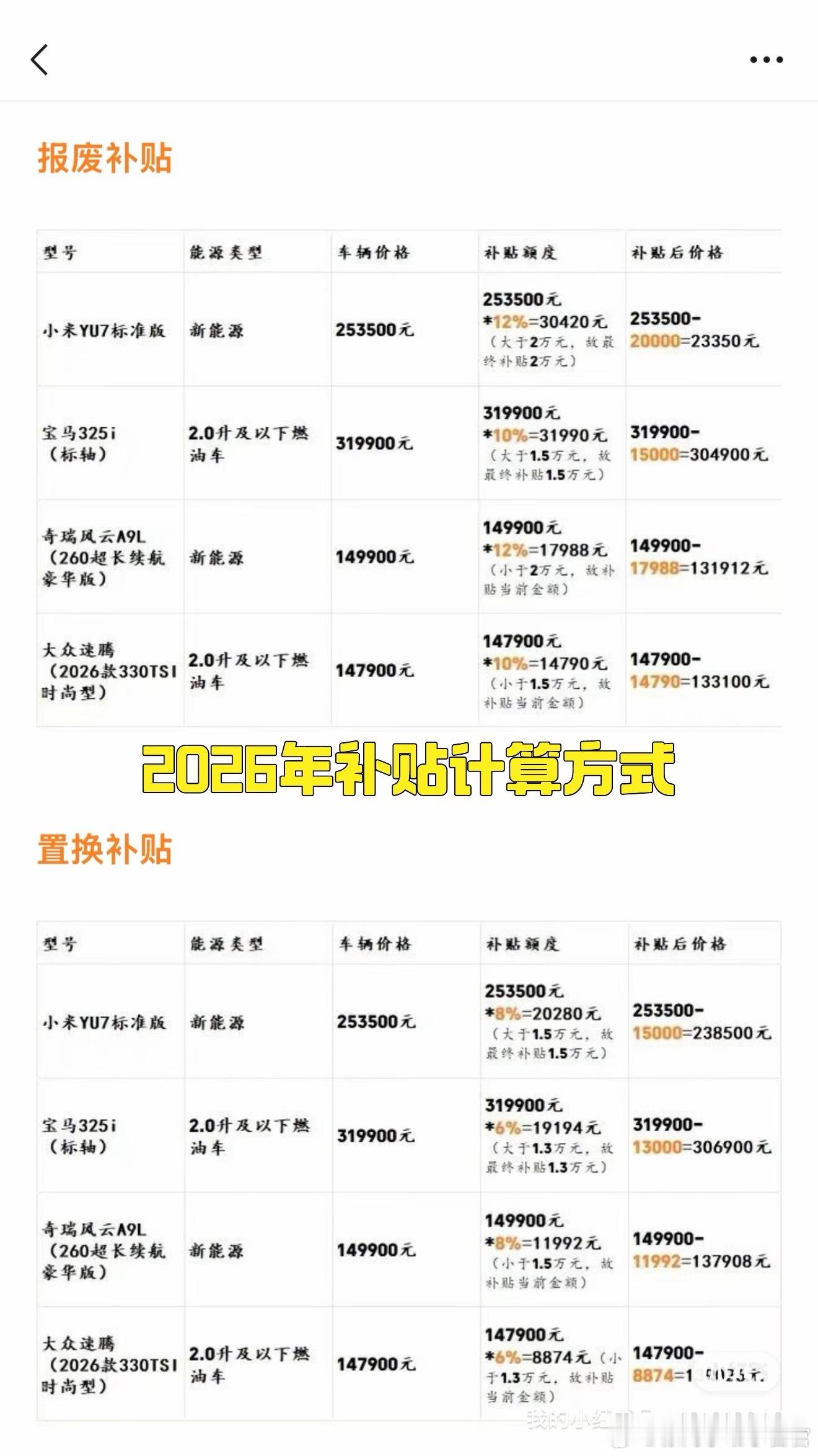 小米汽车(12月30日)日志雷总原定于今晚的直播因病改期到1.3日了,还是很期待拆车直播的,又是一次可以让行业尖叫的盛况有可能也会发布一个新颜色之类的(参考25年元旦发布了洋红,一波疯抢)📈2026年国补新政策来了,计算方式看(图3)总结下来就是:报废补贴最高2万,置换补贴最高1.5万小小透漏一下:可能2026年会有免息政策(不保真),等惊喜🌀YU7(据不完全统计)合计142台1️⃣标准:下线77台,还是有少量顺延,好消息是一部分顺延可以明年再提,这就很香了,不在乎补贴的现在提车也是很可以的,没有大部队,任意时间的都在下线,待年后应该会恢复理性2️⃣Pro:下线55台,有一部分改了现车,很多35-40多周的在正常下线,还有极少数30周左右的3️⃣Max:下线10台,订单确实不多,之前交的太快了🌀SU7(据不完全统计)合计12台【米车派】可以看看更多的小道消息和爆料~徐同学助手小米汽车