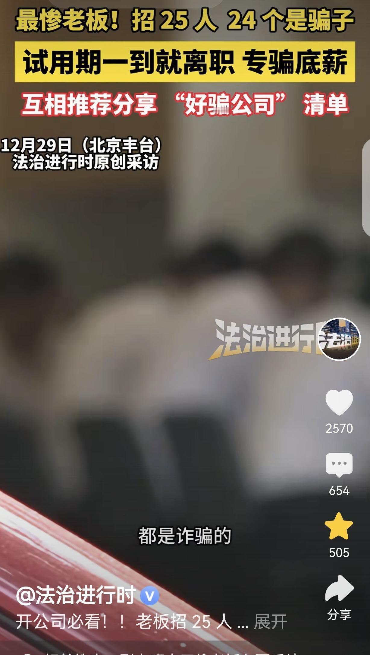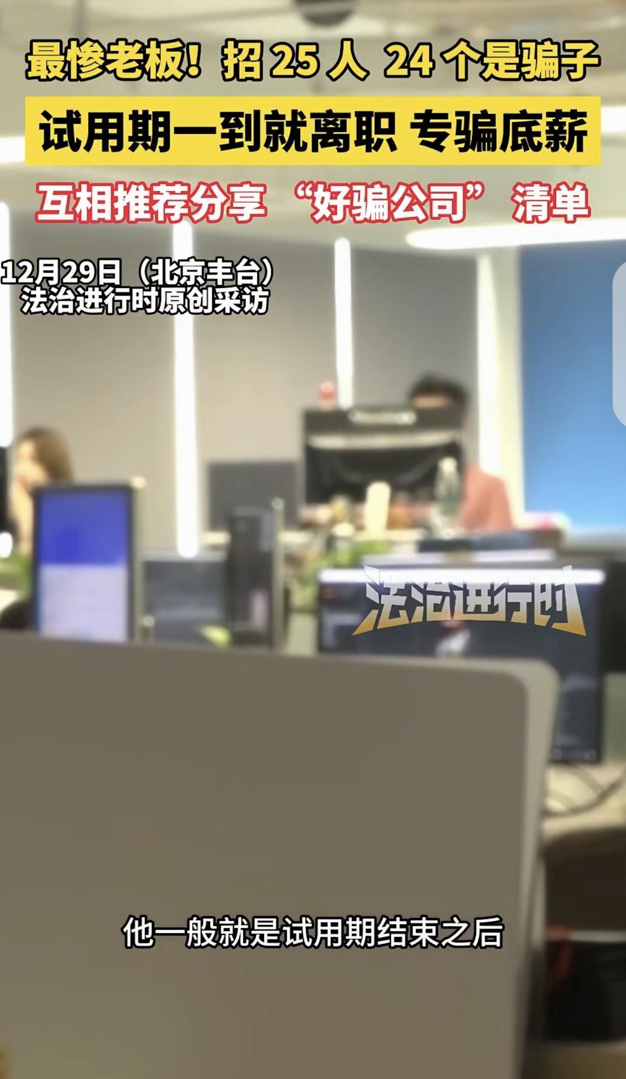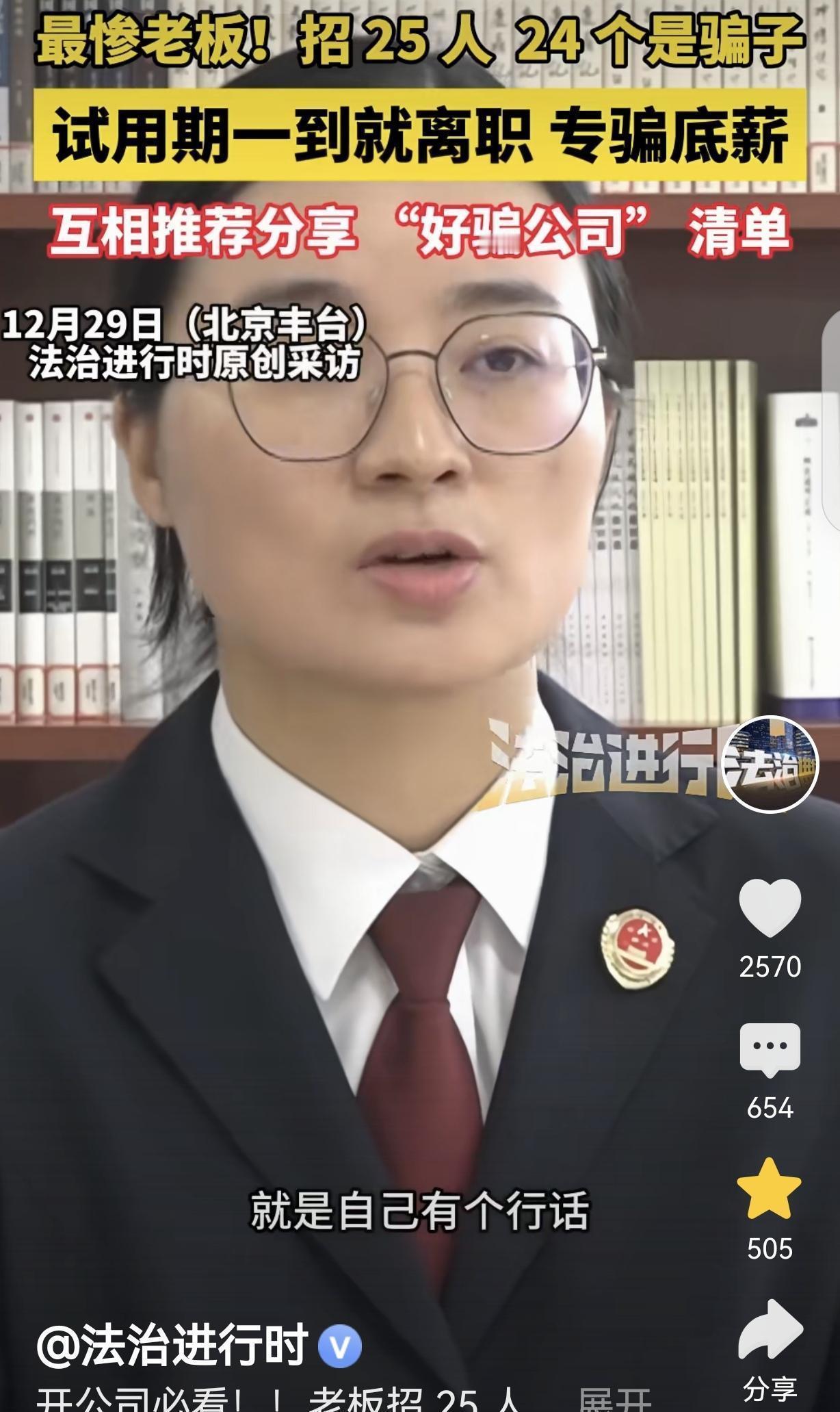 “大冤种!”北京丰台,一女子开公司,招聘25个员工,其中有24个人都是骗子,不需要公司给交社保,试用期一到就离职,拿着底薪脚底抹油,24个人还互相推荐“好骗公司”清单。女子彻底傻眼了。网友:这种公司不冤,懂得都懂!   说个最近在北京丰台发生的事儿,听着都让人觉得魔幻,有个女的开了家公司,想着趁年底扩张一把,就招了25个员工。   本来盼着这些人能帮公司撑起业务,结果最后发现,除了一个是真心干活的,剩下24个全是来骗底薪的。   这伙人坏就坏在,面试的时候特别“懂事”,主动跟老板说不用给他们交社保。   要知道,对于初创公司来说,社保可是一笔不小的开支,老板一听这话,当场就动心了,觉得自己遇上了善解人意的好员工,压根没多想就把人全招了进来。   甚至这24个人里,不少是互相推荐来的,还说自己手里有客户资源,入职就能给公司带来业绩,老板当时还挺得意,以为是自己的公司有吸引力。   其实人家早就私下建了群,把这家公司标成了“好骗的优质目标”,他们心里门儿清,像这种不想交社保、管理又松散的公司,就是最好的“提款机”。   平时上班也全是演戏,因为招的是销售和运营岗,不用天天坐班,这帮人就同时在好几家公司挂职,领着好几份底薪。   偶尔公司开例会,他们要么雇人代签到,要么就在会上装模作样记笔记,实则在群里聊哪家公司更好骗。   最坑的是那个真心干活的员工,还被这伙人里的一个忽悠了,花钱买了所谓的“内推面试辅导”,到最后都不知道自己遇上的是骗子。   三个月试用期一到,这24个人像是约好了一样,同一天以“个人发展”为由提离职,还要求当天就结清工资。   等老板反应过来的时候,人早就全走光了,留下的只有一堆瞎编的客户日志,之前说的那些意向订单,查了之后才知道全是假的,压根就没有这些客户。   这时候老板才算彻底傻眼,一算账,光底薪就花出去近15万,本来想省社保钱,结果反而吃了大亏。   更倒霉的是,因为这三个月的虚假繁荣,公司错过了真正的市场机会,连之前谈好的两个重要客户都因为没人跟进流失了。   事儿传出来之后,网友们的看法出奇一致,都说这家公司不冤,道理很简单,老板一开始就想着钻空子省社保,这种不合规的操作,刚好给了骗子可乘之机。   从法律上来说,老板不给员工交社保本身就是违法的,而这24个人骗底薪的行为,金额早就够了诈骗的立案标准,现在老板也收集了证据报了案,最后大概率是两败俱伤。   说白了,这事儿就是苍蝇不叮无缝的蛋。要是公司一开始就按规矩来,签正规合同、交社保,管理再严格点,骗子根本没机会下手。   而那些想着走捷径、钻规则空子的老板,最后往往都是搬起石头砸自己的脚。   大家对此怎么看?欢迎评论区留下您的观点!