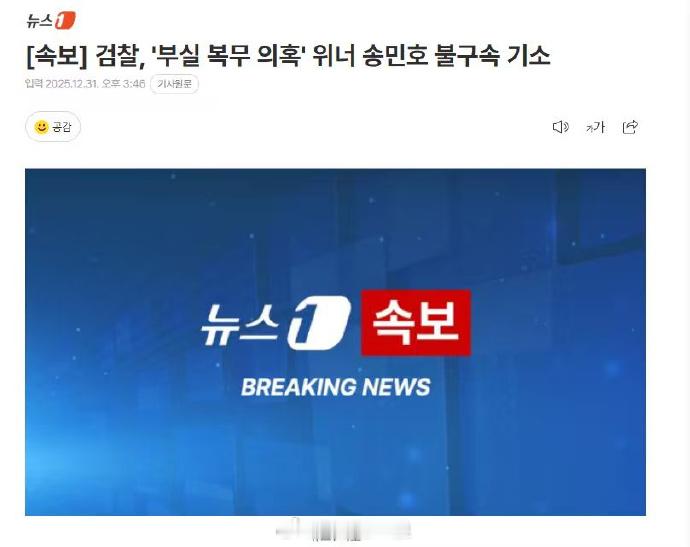 宋旻浩遭起诉宋旻浩以无羁押方式被起诉 据韩媒,首尔西部地方检察厅昨日以违反《兵役法》的嫌疑对宋旻浩进行不拘留起诉,其涉嫌作为社会服务要员(替代役)工作态度不佳。据悉,宋旻浩在警方调查中,基本承认了在工作时间脱离岗位等嫌疑。