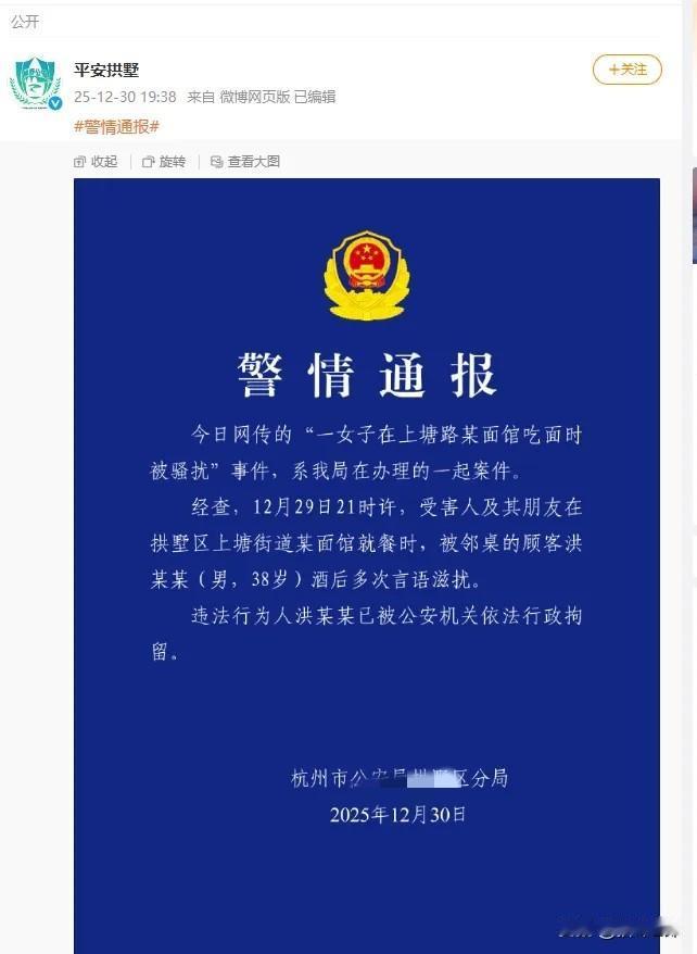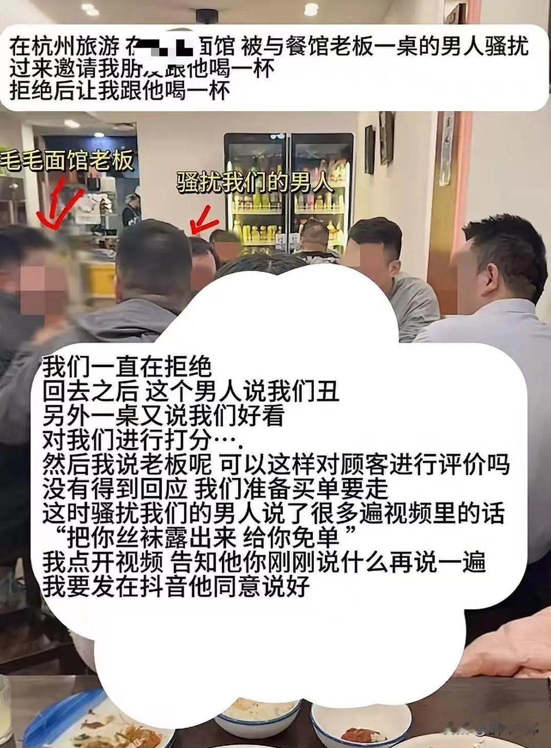 洪某:“把你丝袜露出来,给你免单!” 美女:“刚说什么,再说一遍,我要发在抖音” 洪某:“好的,我乐意让你发,你发吧!” ———————————————————— 这一幕,发生在杭州的一面馆里 两个美女在面馆里就餐,被老板一桌的一男子骚扰,男子先后邀请美女两人喝酒,都被拒绝了,一众男子还对两美女进行“谁更漂亮投票打分”,美女质问老板,老板不回应。 两美女待不下去,准备买单走人,远离是非,不料,男子再次大喊“把你的丝袜露出来,我给你免单”。 美女再也忍不住了,拿起手机录视频🎥说“你再说一遍,我要把你发抖音”,这男子也倒不要脸,说“好呀,我愿意让你发”,于是便把那话再喊了一遍。 随后,美女报知帽子叔叔处理 ———————————————————— 这事儿吧,得先说这面馆老板,消费者在自己的店里消费,就应该保护消费者的权益不受侵犯,在保护顾客的同时,也是在保护自己的品牌形象,更是对自己经营做生意的保护,他倒好,面对质问,一声不吭。 试问,怎么就能允许这样恶劣的事在自己的经营范围内发生呢? 再说这不要脸的洪某,不懂得“出来混迟早要还的”和“祸从口出”的道理吗?行走江湖,多注意自己的言行举止,多提升自己的素质,做人要本分,别因为一时的口嗨冲动惹上不必要的麻烦。 最后说说这两美女,面对不公和骚扰,大胆维护自身权益,没有过激行为,懂得采集保留证据。必须为她们点赞👍👍 这种事情 如果你是这美女,你会怎么做? 又如果你是老板,你又会怎么做?