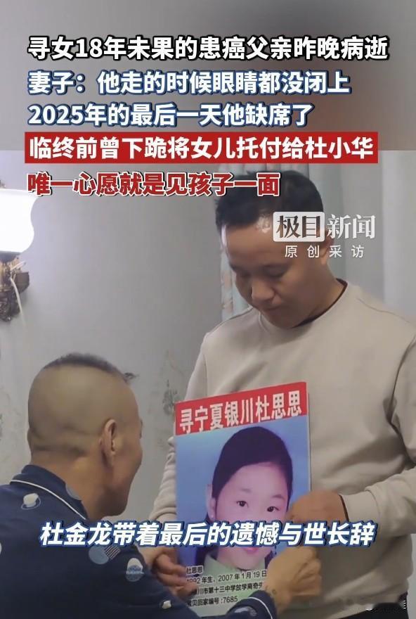 很遗憾,寻女18年的杜金龙还是带着遗憾走了。2025年的最后一天,这位60岁的患癌父亲没能等到和女儿杜思思重逢的时刻,就连离开时眼睛都没闭上。他这辈子几乎把所有精力都耗在了寻女路上,从女儿走失的那天起,风里雨里跑遍各地,哪怕后来查出癌症,也没停下找孩子的脚步。 临终前,他甚至下跪把寻女的心愿托付给杜小华,嘴里念叨的还是想再见孩子一面。妻子说,他到最后都抱着女儿的寻人启事,那是他18年里唯一的执念。一个父亲的半生期盼,最终还是败给了命运,只希望这份遗憾能被看见,也盼着杜思思能早日知道父亲的心意,让这份迟到的团聚能以另一种方式圆满。