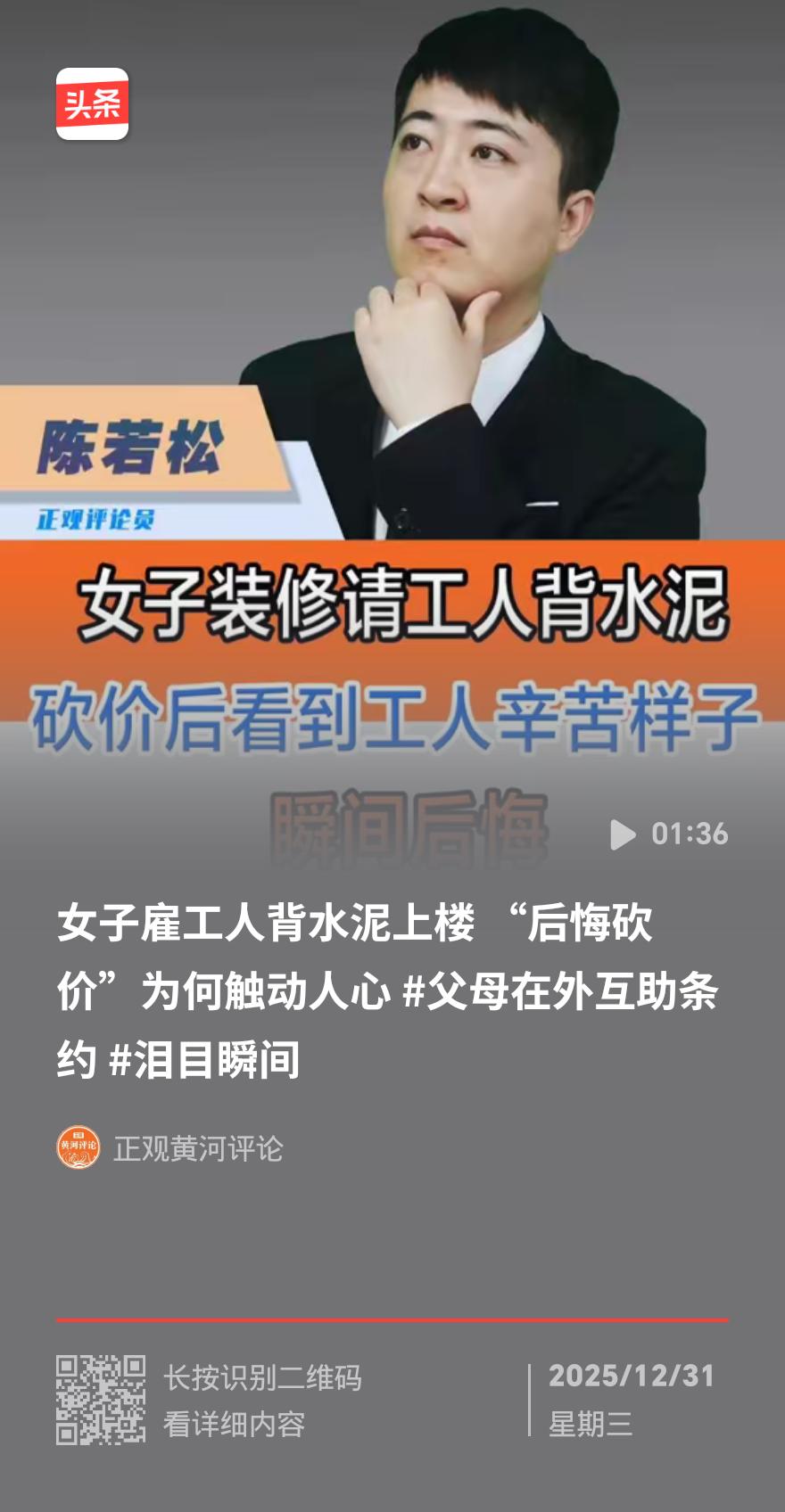 砍价省30块,转身补200!河南女子雇老人扛水泥,这波操作看哭网友 河南一段装修视频火遍全网,一位女子的举动戳中无数人的心窝。 女子家里装修,雇来一位白发老人扛水泥。一袋50公斤的水泥要徒手扛上五楼,老人报价5元一袋。女子习惯性砍价,最终以4元一袋的价格成交,30袋水泥算下来,整整省了30块钱。 老人没多说一句话,扛起水泥就往楼梯上挪。佝偻的脊背被压得更弯,汗水顺着额头往下淌,浸湿了后背的衣衫。一趟又一趟,等扛完最后一袋水泥,老人扶着墙大口喘气,伸出的手止不住地发抖。 看着老人疲惫不堪的模样,女子心里瞬间不是滋味。那省下的30块钱,此刻变得无比烫手。她当即掏出200块钱硬塞给老人,满脸愧疚地说:“叔,对不起,我占便宜了。” 老人愣了愣,连连摆手道谢,颤抖着手接过了钱。 这段视频传到网上,网友纷纷破防。大家感慨,砍价是普通人的生活常态,可面对靠力气讨生活的老人,那份愧疚感终究压过了省钱的小算计。女子递过去的200块,补的不是差价,是藏在烟火人间里的善意与温暖。扛水泥的老人 搬运水泥工人 水泥价格