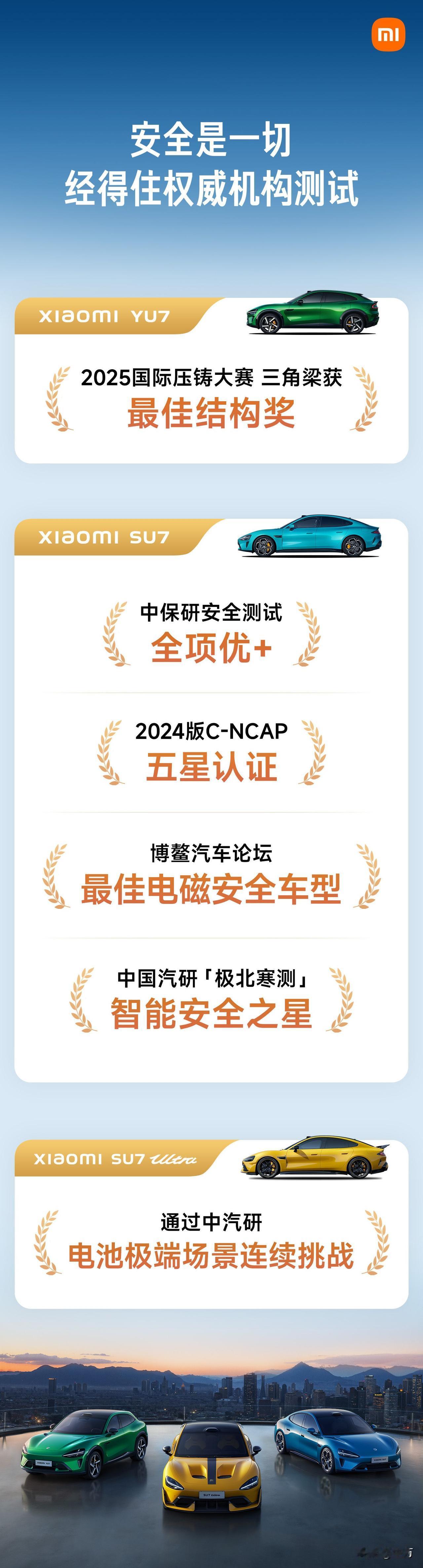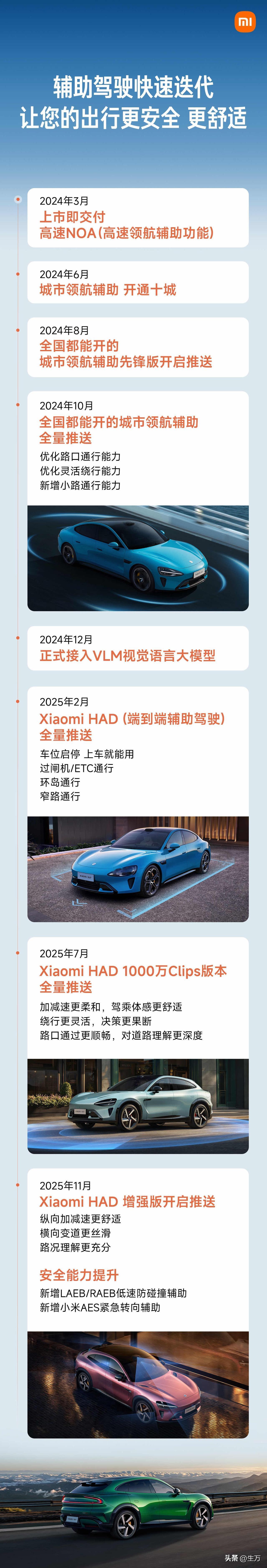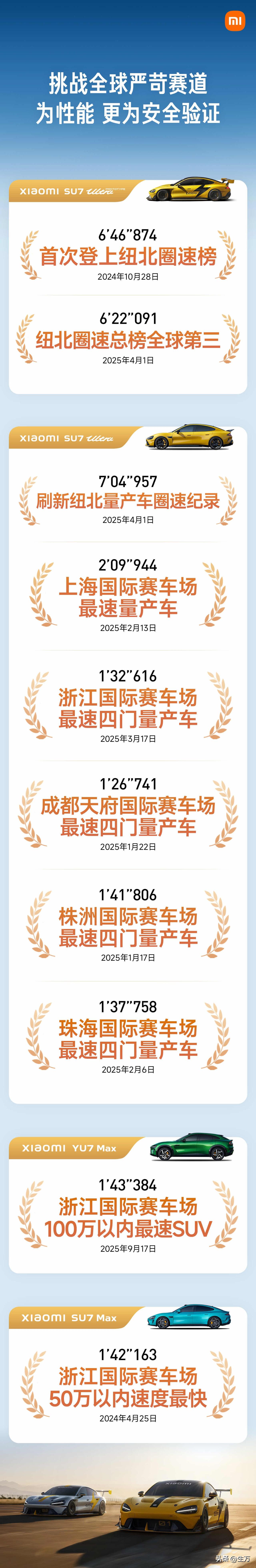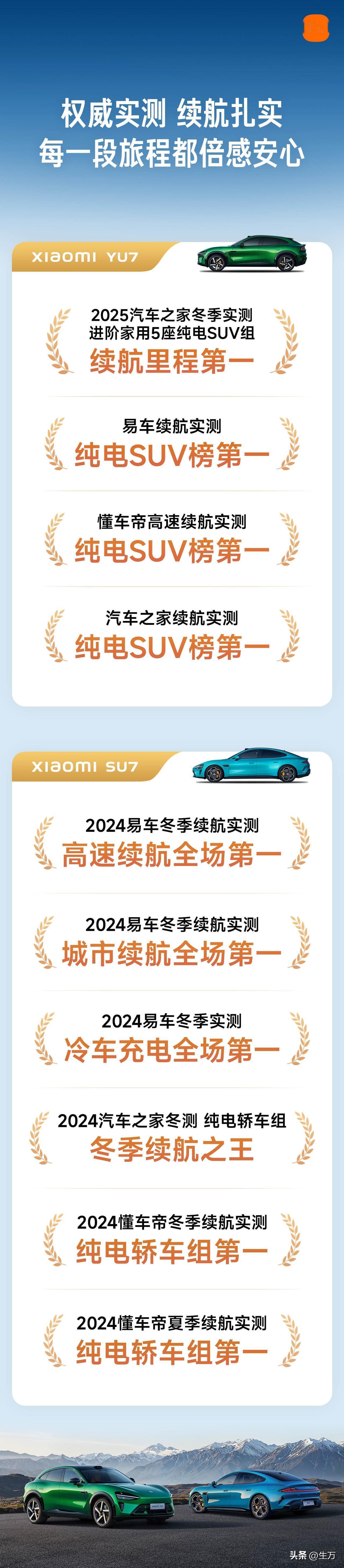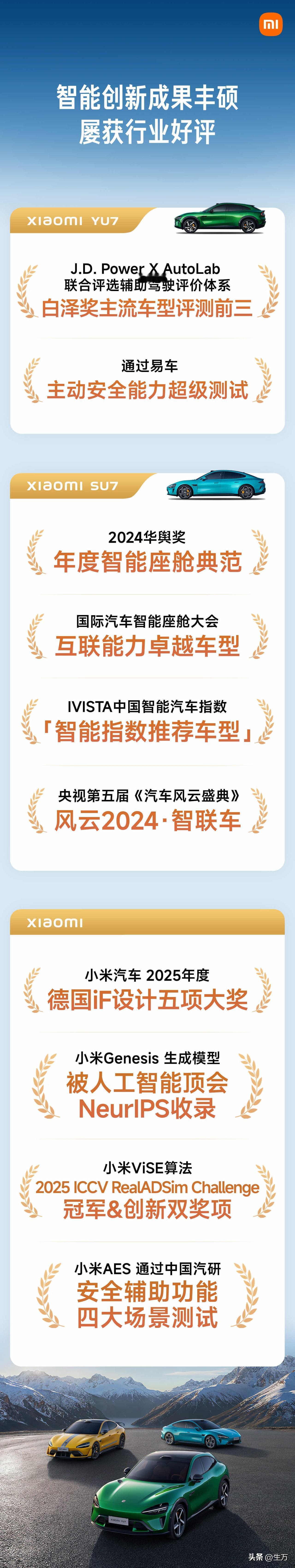王化盘点小米汽车这一年的成绩! 就在刚才,王化转发了小米官方社交网络发出来的九张图片,这个图片还是比较全面,他们从九个大的板块来总结小米汽车这一年获得的成绩。 首先是他们最新的交付成绩截止今天为止已经超过了500,000台,与之前雷军要求的目标任务提前了一个多月完成。 其实就是这些车的车主使用里程,以及他们的销售网络建设,和辅助驾驶这几个板块,还强调他们的基础设施建设投入和安全方面的投入。 然后就着重地介绍了他们的小米辅助驾驶系统,以及获得的各种安全奖项,包括各个赛道取得的成绩,以及各种各样的奖项五花八门的很多。 而且根据最新他们透露出的消息,小敏明年他们还会出四款新的车型,最初的小米SU7要出一个更新迭代的版本之外,还会有一个七座版本的大型SUV,和一个5座版本的加强型SUV。 如果这几个车型其中的任何一款,它的销量能够超过今年这款SUV的话,那么估计他们明年的年度销售,和交付数字,可能还会超过500,000台。 当然,以上这几点都寄予一个大的前提,那就是一切要顺顺利利的才行,不管怎么样,小米汽车到目前为止所取得的成绩,对他们来说是超越期待的。