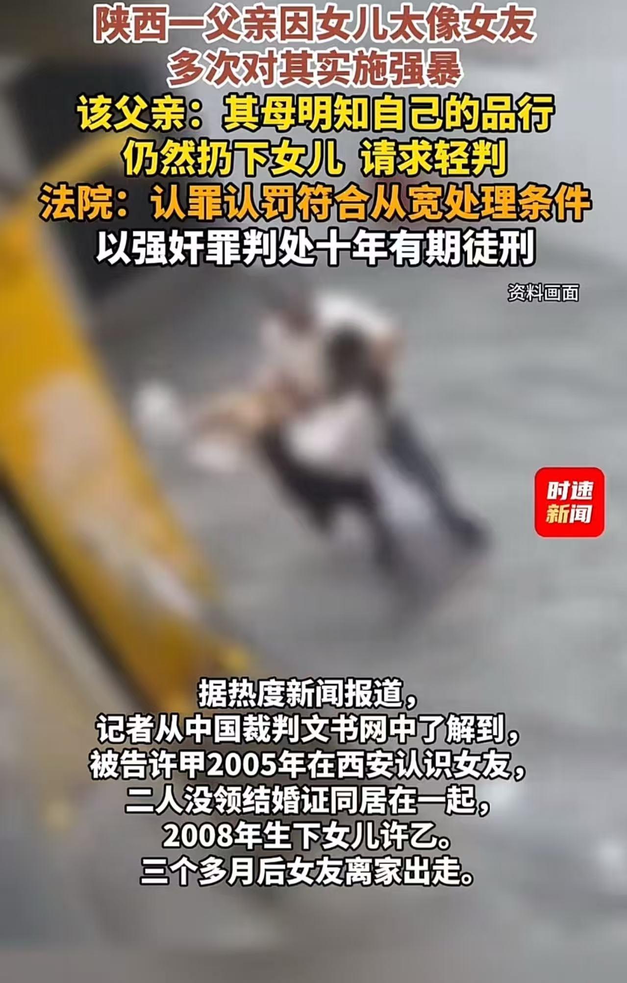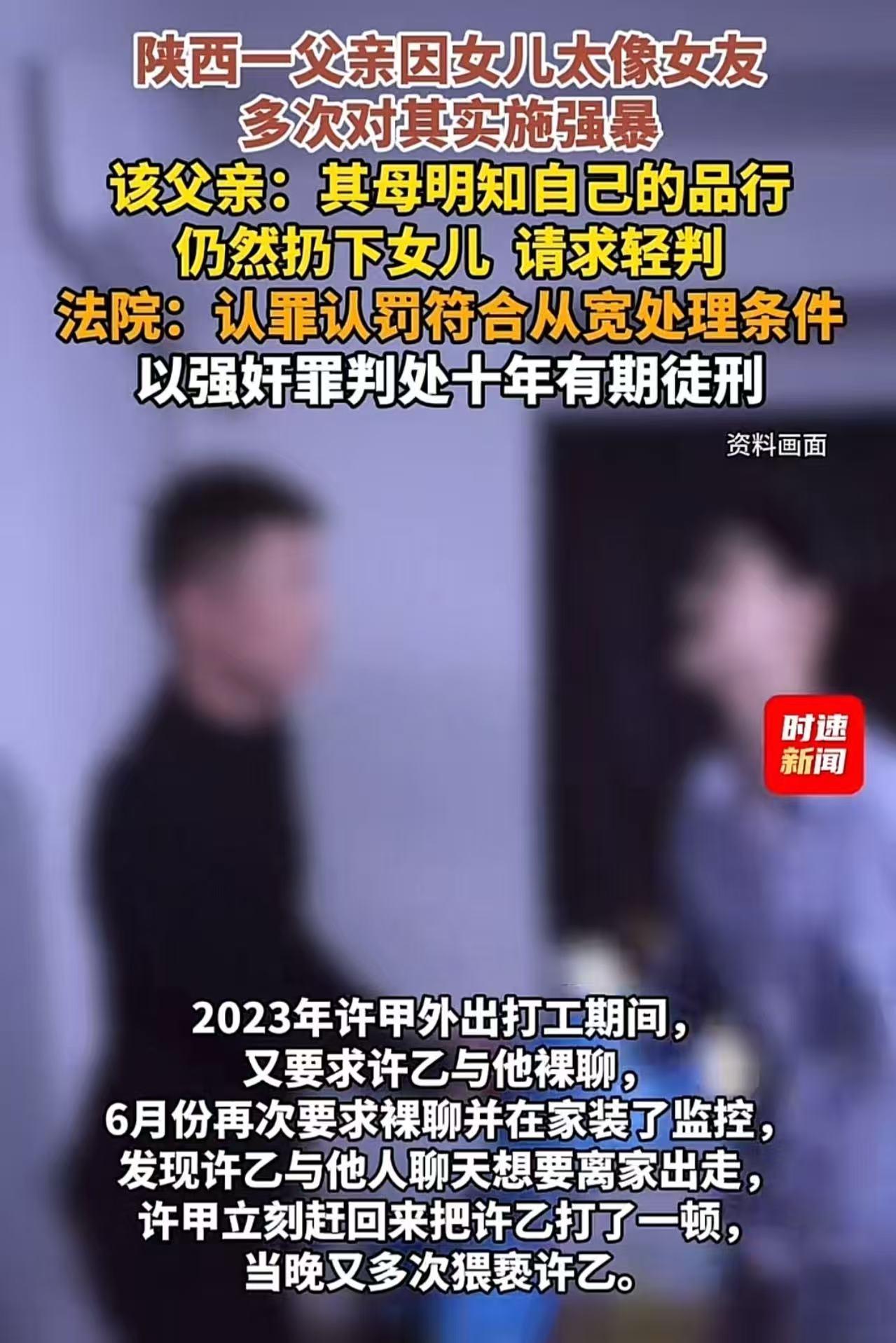 陕西,一男子多次性侵亲生女儿,被抓后辩称,女儿长得像她母亲,才产生异样感情。其母亲明知自己的品行,仍然扔下女儿,也有一定责任,请求轻判!法院:认罪认罚符合从宽处理条件,以强奸罪判处有期徒刑十年。 (来源:时速新闻) 2005年,许杰(化名)在西安邂逅了自己的初恋女友,两人情投意合,很快便坠入爱河,没有领取结婚证,就同居生活在了一起。 2008年,他们的爱情结晶——女儿许燕(化名)呱呱坠地。本以为这个小生命的到来,会让这个家庭充满欢声笑语,开启幸福美满的新篇章。 可是女儿出生仅仅3个月,许杰和女友就因为一些琐事大吵了一架,女友一气之下,离家出走,从此音信全无。 在之后的日子里,许杰独自承担起抚养女儿的重任。他的心理逐渐扭曲,最终,丧心病狂的事情发生了。 许杰竟然对自己的亲生女儿产生了异样的感情。他交代称,随着许燕一天天长大,模样越来越像她的母亲,这让他内心深处那扭曲的欲望开始蠢蠢欲动。 2021年初,许杰带着13岁的许燕回老家祭祖。看着青春年少、亭亭玉立的许燕,许杰心中的恶魔彻底被唤醒,他竟产生了侵犯女儿的冲动。 许燕惊恐万分,她拼命反抗,甚至拿着一把小刀放在自己脖子上,以死相逼,声嘶力竭地喊道:“你要是敢碰我,我就死给你看!” 许杰看到女儿如此决绝,害怕事情闹大,只好暂时罢手。 但许杰的罪恶并没有就此停止。2022年5月份,他趁着许燕熟睡之际,强行对她隔着内裤实行猥亵行为。完事后,他还小心翼翼地用卫生纸擦干净痕迹,试图掩盖自己的罪行。 而且,这样的猥亵行为在2022年竟然发生了多次。许燕内心充满了恐惧和绝望,她害怕这件事曝光后会遭到周围人的异样眼光,更害怕许杰的威胁报复,只能默默忍受着这非人的折磨。 2023年,许杰外出打工,许燕以为自己终于可以摆脱这个恶魔的掌控,获得一丝喘息的机会。然而,许杰的罪恶行径却变本加厉。他要求许燕与他进行裸聊,还在家中偷偷安装了监控摄像头,时刻监视着许燕的一举一动。 当他发现许燕与他人聊天,并且有离家出走的念头时,立刻赶回家中,对许燕拳打脚踢,将她打得遍体鳞伤。当晚,许杰又多次对许燕进行猥亵,最终突破了最后的底线,对许燕实施了强奸。 6月28日,许燕终于忍无可忍,她鼓起勇气,向警方报案称自己被父亲强奸。 当天,许杰就被警方传唤到案。在法庭上,许杰为了减轻自己的罪责,竟然厚颜无耻地辩称自己是初犯,以前从无违法犯罪记录,还保留了一定的良知底线。 更令人气愤的是,他还把责任推到孩子母亲身上,声称孩子母亲明知自己的品行,却仍然扔下女儿,让她置于危险之中,也负有一定责任,请求法院对他从轻判决。 法院经过审理认为,许杰的行为严重丧失了人伦底线,给年幼的孩子造成了不可磨灭的身心伤害,其罪行令人发指。但考虑到许杰认罪认罚,符合从宽处理的条件,最终以强奸罪判处许杰有期徒刑十年。 此事引发热议,有网友说,我去,这样还能轻判???那可是他闺女! 也有网友说,法网可以有柔情,但不是对那些毫无道德和人性的罪犯,这不仅仅是立法目的问题更是法律所维护的社会理念和最起码的人伦! 还有网友说,判得太轻了!一个这样丧心病狂的人,为了脱罪什么都做的出来,态度好就能轻判这是什么逻辑?才判了十年,如果减刑那没几年就出来了。女儿还那么年轻,这将是女孩一辈子的恐惧和阴影。 这起案件,不仅仅是一个家庭的悲剧,更是对整个社会道德和法律底线的严重挑战。许杰作为父亲,本应是女儿的保护伞,却成为了伤害女儿的恶魔,他的行为是对亲情、人伦的彻底背叛。 而孩子母亲在女儿出生后便离家出走,虽然有其自身的原因,但也不能成为许杰逃避罪责的借口。 法律虽然给予了许杰一定的从宽处理,但这绝不能掩盖他所犯下的滔天罪行,这样的父亲根本枉为人!