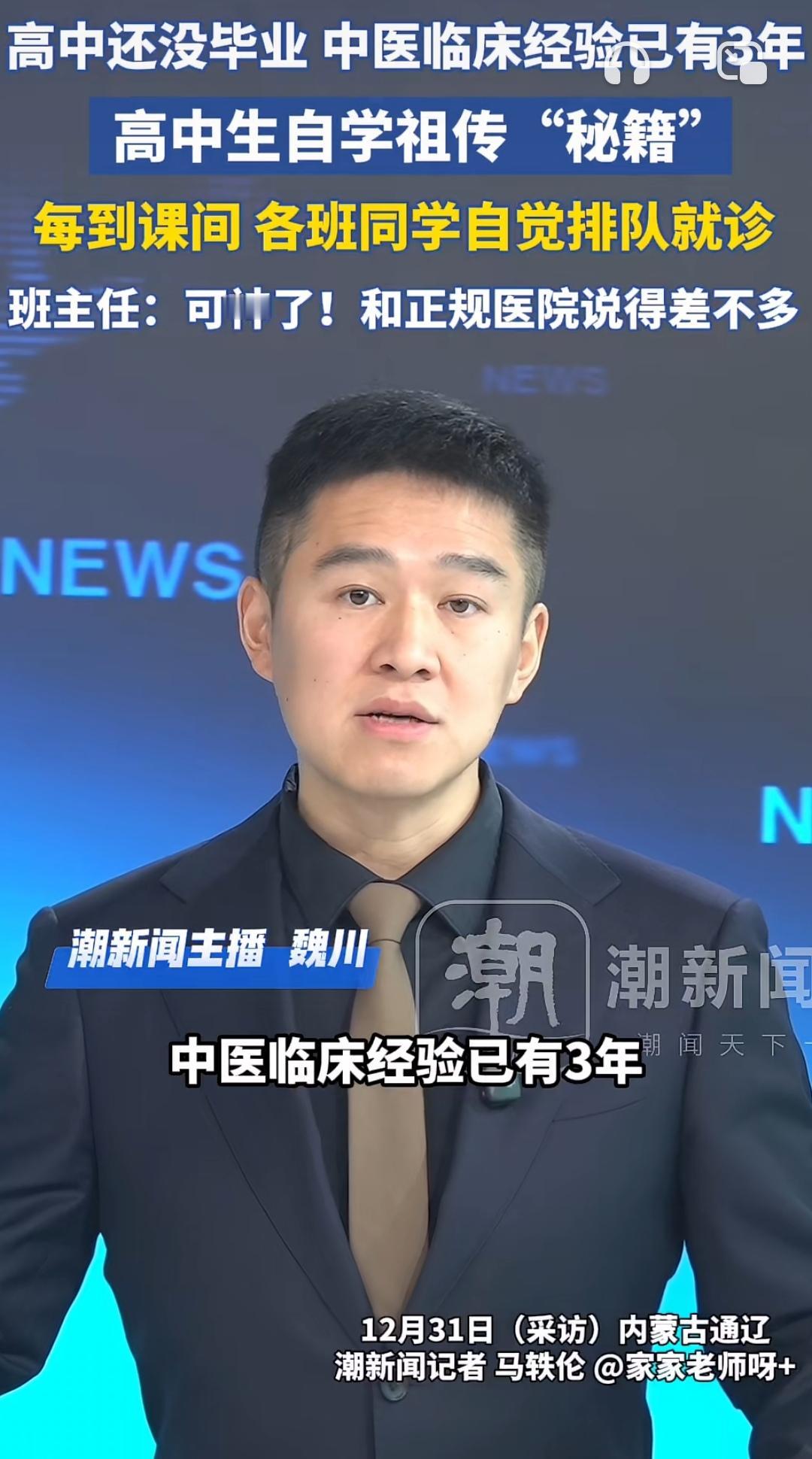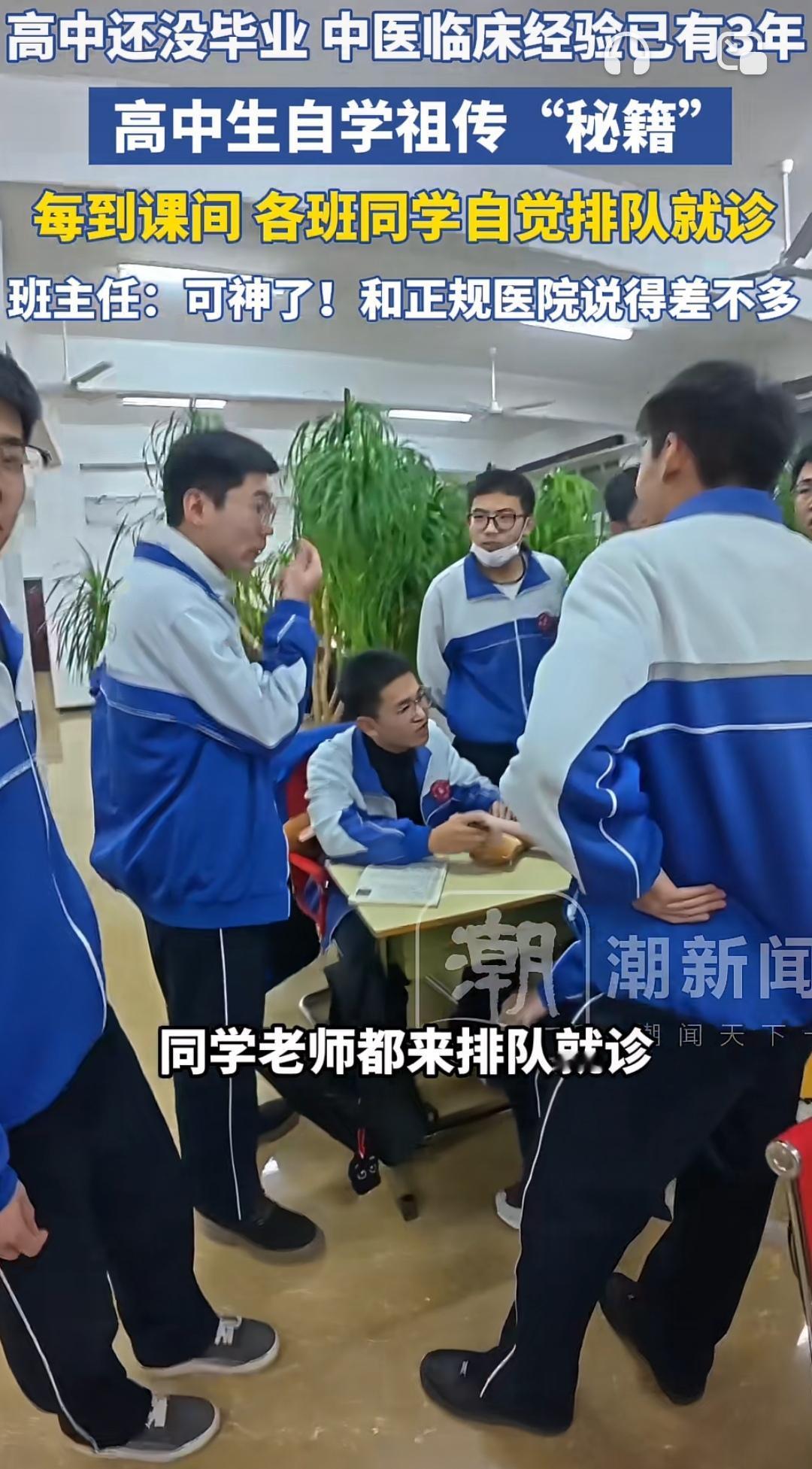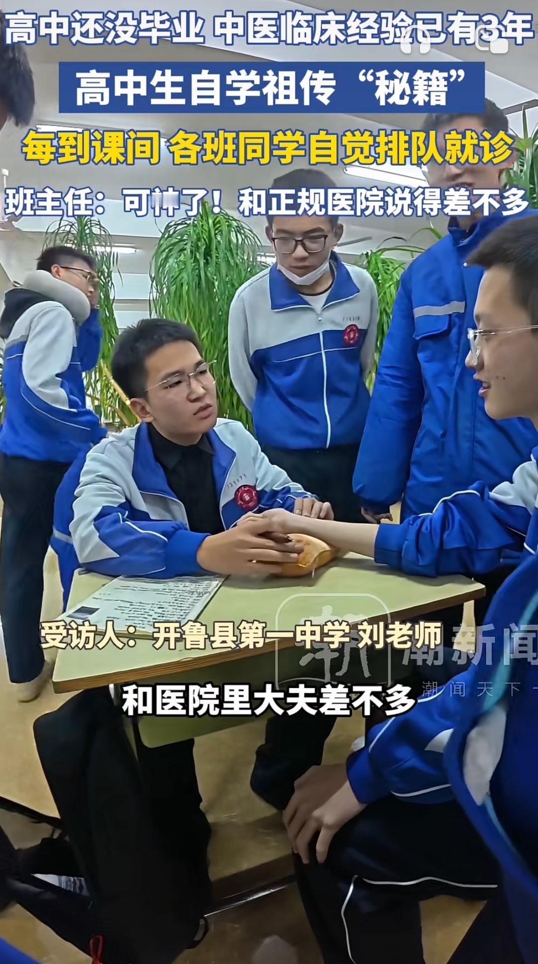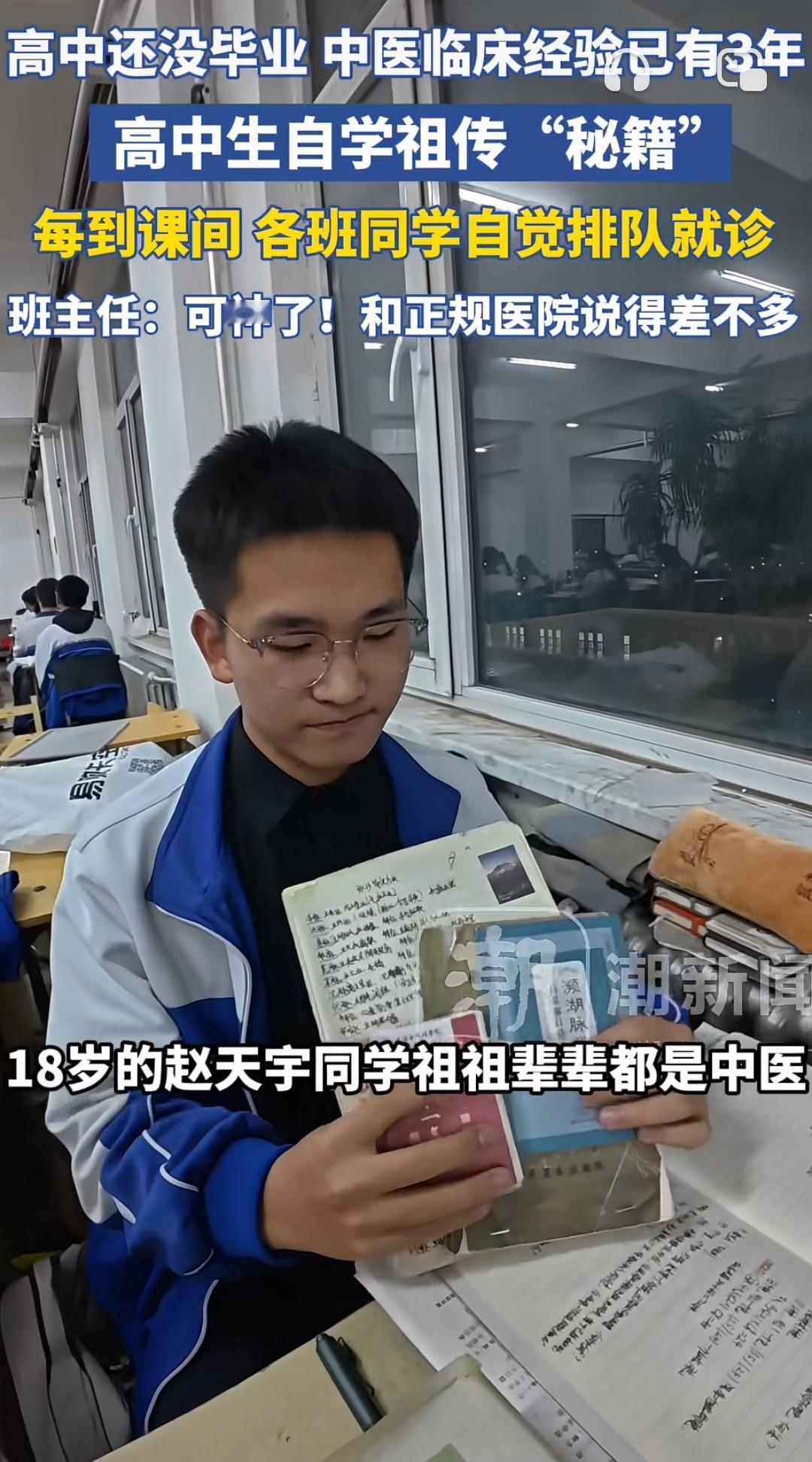 00后校园“小中医”火了!课间把脉神似专业大夫 内蒙古通辽高三生赵天宇,课间成了同学追捧的“问诊师”。因爷爷调理身体结缘中医,他课余啃《黄帝内经》、学线上课程,两年摸索出脉诊技巧。 指尖搭腕间,他能精准点出同学“熬夜多”“气血不足”,诊断结果竟和医院大夫基本一致。更难得的是,他始终强调“仅看亚健康,不适必就医”,文化课也没落下。 青春不只有刷题,这份对传统文化的热爱与严谨,太圈粉!支持点赞👍