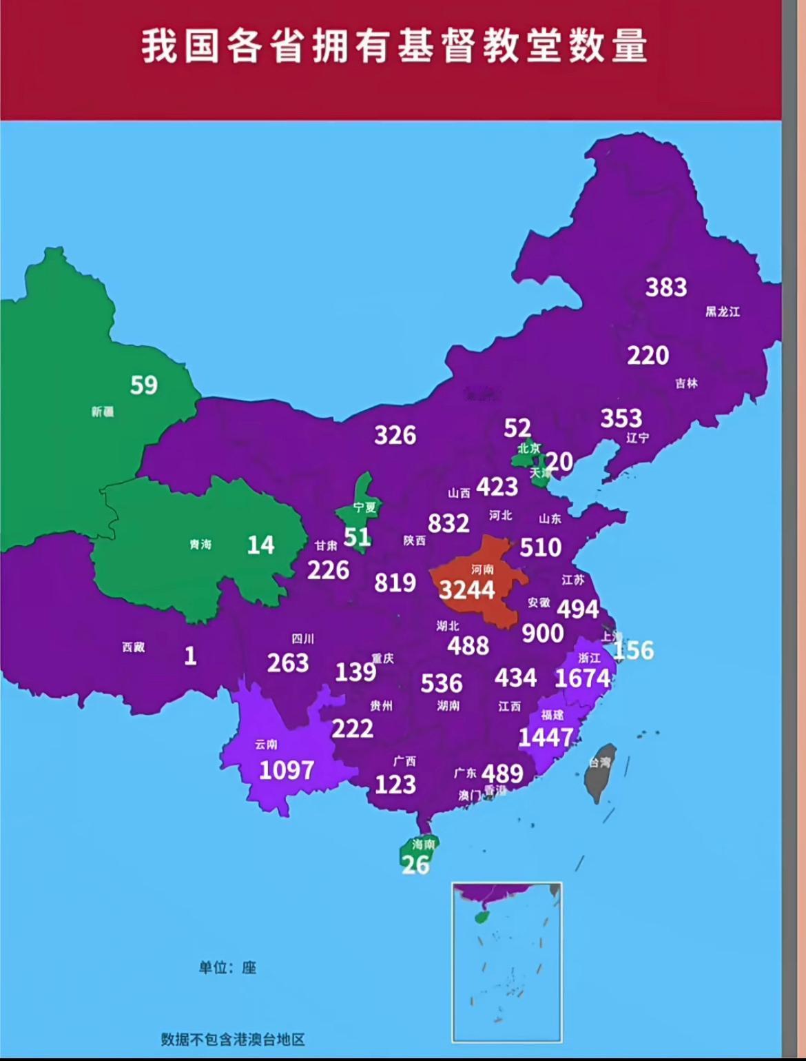 我国各省拥有的基督教堂数量图。 河南的教堂数量最多,拥有3244座。 教堂 基督