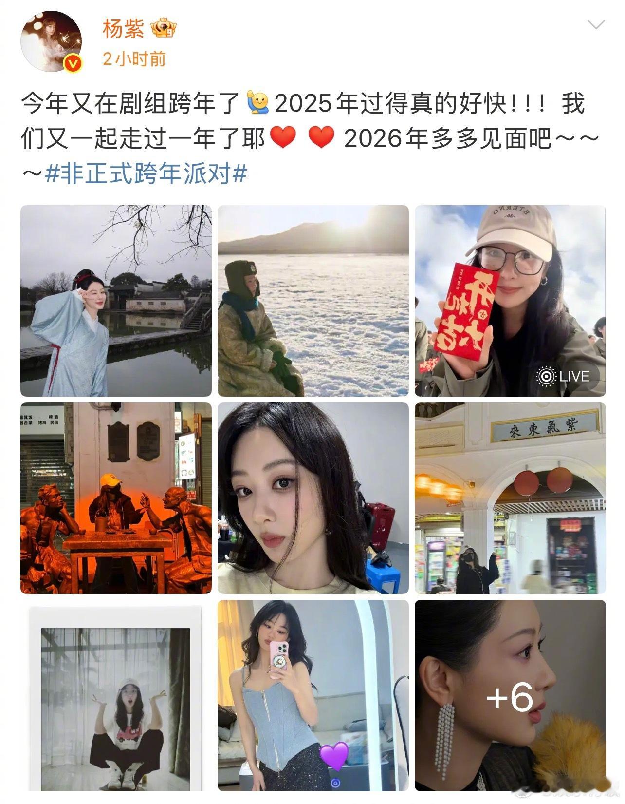 杨紫2025年从古代到现代到民国杨紫今年又在剧组跨年了 回顾的 2025 年,无缝解锁三重时空从明代徽州的制墨匠人李祯,到高原上守护生态的巡山女警白菊,再到民国传奇女性董竹君,几百年时间跨度 + 不同时代底色,每一个角色都拼尽全力打磨~期待杨紫 2026 年这些诚意之作陆续和大家见面~杨紫