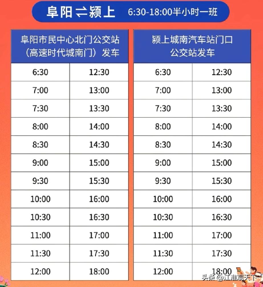 阜阳市区至颍上县的站点巴士明天开通,优惠票价6.9元 阜阳市,颍上县的老乡们,安徽皖美出行消息,2026年1月1号开始,阜阳至颍上县的站点巴士开通,优惠票价12.9元,提前一天买票只要6.9元。 阜阳市区有5个站点可以上下车,包括市医院南区,汽车南站等,颍上县有7个站点可以上下车,包括新人民医院,城北客运站等,30分钟一班车,从早上6点半,到晚上6点,按照班次发车。 安徽阜阳市区,颍上县的老乡们,互相来往就非常方便了,可以选择就近站点上下车,避免了转车折腾。 交通出行越来越方便,市民幸福感会大大提升。 元旦以后,阜阳市区,颍上县城,来往的便利性会极大提升起来。颍上专线车 颍上中巴车 阜阳临泉专线 阜阳中巴车 阜阳颖上回程车 阜阳通勤包车