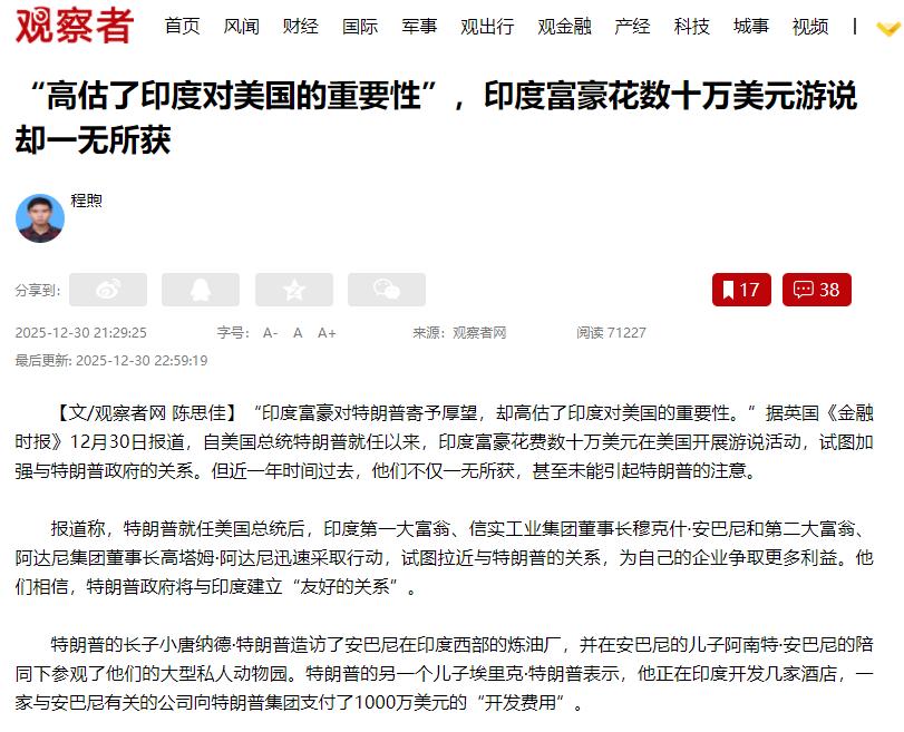 印度的富豪们都要“崩溃了”!这特朗普怎么油盐不进! 据英国《金融时报》12月30日报道,特朗普当上美国总统后,印度的富豪们跟抓住救命稻草似的,立马凑钱花了几十万美元去美国搞游说,一门心思想跟特朗普政府搞好关系,为自家生意铺条顺道。 结果呢?前前后后忙活了快一年,别说拿到好处了,连特朗普本人可能都不知道他们是谁。 说真的,这事儿挺可笑的,这些在印度国内呼风唤雨的富豪,早就习惯了用钱打通关系,总觉得美国也吃这一套,以为砸点钱就能轻松搭上特朗普的线,没想到最后碰了一鼻子灰。 说到底,他们就犯了一个致命的错:把印度在美国心里的分量想得太重,完全没搞懂美国外交只看利益的底层逻辑。 这事儿里最上心的俩印度顶级富豪,一个是信实工业的穆克什·安巴尼,一个是阿达尼集团的高塔姆·阿达尼,都是身价千亿级的主儿。 为了游说成功,他俩前前后后砸了几十万游说费,不光花钱请专业团队运作,还亲自下场攀私人关系,今天请特朗普家人参观企业,明天主动表忠心配合美国制裁,可到头来全是白费功夫,连特朗普的面都没正经搭上。 其实他俩这跟头栽得一点不冤,因为美国自始至终就没把印度真正放在眼里,这点从印度总理莫迪和特朗普的相处模式里,就能看得明明白白。 莫迪之前跟特朗普处得那叫一个热络,公开场合又是通电话又是互邀访问,张口闭口喊特朗普“亲爱的朋友”,俩人同框时的亲密劲儿,看着就跟穿一条裤子似的。 可这全是表面功夫,一旦触及印度的核心利益,莫迪半点不含糊,直接翻脸硬刚。 就说美国一直惦记的印度市场,特朗普总想让印度开放农产品市场,逼着印度买美国的大豆、乳制品,还要求印度取消对美国互联网巨头的额外税收,为美国企业铺路。 为了达成目的,特朗普三番五次施压,甚至拿出加征50%关税的狠招威胁,结果莫迪压根不买账。 要知道,这些领域关系到印度国内大量农民和本土企业的利益,莫迪要是妥协了,选民基础就得动摇,所以他硬顶着压力谈了好几次贸易谈判,次次都没谈成。特朗普再横,也没辙,根本拿捏不了他。 连印度总理莫迪都没把美国的施压当回事,对美国压根没那么信任,这些印度富豪到底是怎么想的,居然觉得特朗普会看上他们那点游说费? 说白了,要么是他们太天真,被美印表面的友好假象骗了,没看清美印关系“利益至上”的本质。 要么就是给的钱还不够多,毕竟他们不是马斯克,没有那种能左右美国产业、给特朗普带来巨额利益的实力和资本。 马斯克能让特朗普另眼相看,是因为他手里的企业能影响美国的科技、新能源等关键领域,而印度富豪的那点诉求,在特朗普眼里根本不值一提。 要知道特朗普政府向来把“美国优先”刻在骨子里,不管跟哪个国家打交道,都只算自己的账,有用就把对方拉过来当棋子,没用就随手扔一边,半点情分都不讲。 这次给印度加征50%关税,表面上是因为印度购买俄罗斯石油,跟美国的对俄制裁政策唱反调,实际就是借题发挥,逼着印度在经济利益上让步。 在这种关乎美国核心利益的博弈里,富豪们那点几十万的游说费,简直就是杯水车薪,根本入不了特朗普的眼,自然也就起不到任何作用。 所以说,这俩印度富豪的游说行为,从头到尾就是一场笑话百出的闹剧,钱花出去不少,脸也丢尽了,最后啥也没捞着。 说到底,还是他们没认清国际交往的现实:国际上的交情从来都靠实力说话,不是靠砸钱讨好来的。 这也给所有想依附大国的势力提了个醒,靠讨好和依附换不来真正的尊重,只有自身足够强大,能和对方平等对话、相互制衡,才能在国际舞台上站稳脚跟,不然再怎么讨好别人,也只能是热脸贴冷屁股。