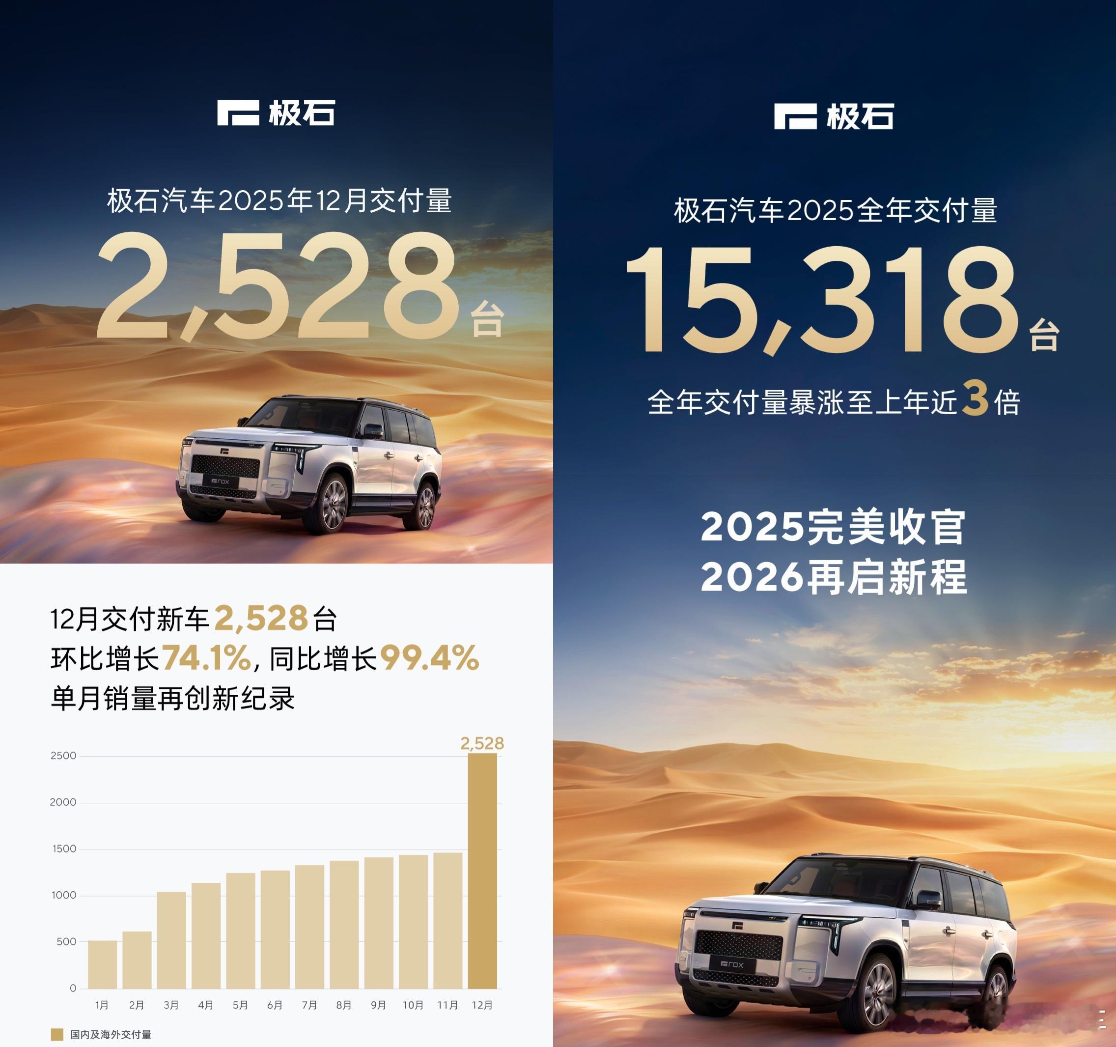极石员工发完海报,可以安心放假过节了。12月销量2528台,2025全年销量15318台。新能源汽车极石ADAMAS