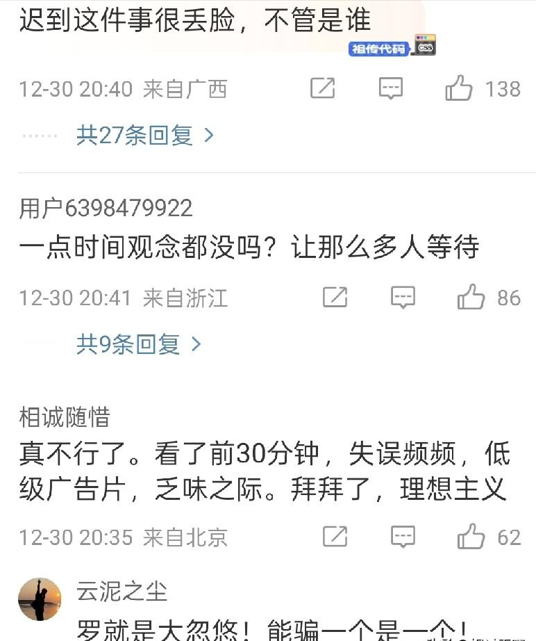 最让人无语的是,罗永浩平时总把“诚信”挂在嘴边,可作为活动主理人,这么重要的场合居然迟到50分钟,事后只轻描淡写一句“发生了一些事情”就想带过。