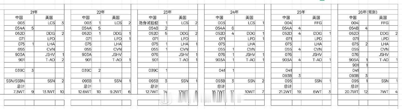 又到了一年一度的中美主战舰艇下水数量/吨位年终盘点环节! 2025年是中国十四五规划的收官之年,是中国主战舰艇下水大年!今年中国下水了19艘主战舰艇,下水吨位约21.2万吨,再次毫无悬念地超过美国。 美国2025年仅下水了3艘主战舰艇,仅有可怜的6万吨,还中国的不到30%。在过去十二年间仅有一年美国的主战舰艇下水吨位超过中国 整个十四五期间中国一共下水了69艘主战舰艇、下水吨位约70.5万吨,超过除中美以外任意一国海军的主战舰艇吨位总量 而同期美国一共仅下水了34艘主战舰艇,下水吨位约50.3万吨,为中国的49%/71%,且因为造船工业的衰落年下水数量逐渐减少,下水吨位直线下降。连五角大楼的订单都完成不了,造成舰艇订单积压越来越多 [马思纯的微笑] 护卫舰(FFG): 2025年中国完成了最后4艘成熟的054A订单,总计下水了50艘054A。2026年054B二批次开始下水,预计下水4艘,二批次目前总订单量为8艘。期待全新一代全电远洋护卫舰! 美国的星座级护卫舰已被正式取消,仅剩已开工的两艘订单,首舰目前建造进度仅为12%,何时下水遥遥无期 驱逐舰(DDG): 中国2025年下水了4艘052D,4艘055型驱逐舰,总记下水了八艘宙斯盾驱逐舰,完成了十四五 20艘盾舰的订单(14艘052D+6艘055),其中055型年下水量再创新高。 052D的建造告一段落,期待新的“9000岁”通用驱逐舰开工! 美国2025年仅下水一艘伯克 Ⅲ型驱逐舰(DDG-129),另一艘DDG-126其实已经在水里,但其建造进度未达到军方下水标准,建造方巴斯钢铁并不敢宣布其正式“下水”,目前处在命名/受洗阶段 两栖登陆舰/攻击舰(LPD/LHA): 中国2025年未下水两栖登陆舰/攻击舰,但是已经开工建造二批次075,首批订单两艘,双线,建造预计2026年下水二艘,总订单预计四艘。 美国:无。其造船业的状况每况愈下,造成LPD/LHA这种大型舰艇的建造极其缓慢,2026年都不一定有此类舰艇下水,预计2027年才能下水下一艘两栖登陆舰 LPD-30 [允悲] 补给舰: 今年是中国补给舰建造大年,2025年下水了四艘903A;随着福建舰的入列,2026年还将继续建造901A/903A 大型补给舰。 美国2025年下水一艘约翰.刘易斯级补给舰(T-AO-210)。 潜艇: 中国2025年继续下水了3艘093B--攻击核潜艇中的052D,三年多下水了10艘093B,水下力量进入持续高速发展期 美国2025年下水了1艘弗吉尼亚级Block Ⅳ型攻击核潜艇(SSN-800),另一艘SSN-801建造进度缓慢,处于举行了命名/受洗仪式但未正式下水阶段。。 总结: 2025年中国主战舰艇的下水速度再创5年新高,完美完成十四五的收官;2026年是十五五的开局之年,中国将继续高速建造,不会像十四五开局那样有很大的空档期。预计下水吨位同样超过20万吨 [酷] 而美国则随着其舰船制造业的持续衰落而举步维艰,越来越慢,2026年的主战舰艇下水数量/吨位将继续维持低位 [马思纯的微笑] 美国2026财年国防预算仅增长1%(9010亿美元),算上通胀则实质下降约2%,其中海军预算仅增长1%(2585亿美元),同样实际下降约2% 预计2026年美国下水主战舰艇: 二艘阿利.伯克级Block Ⅲ型驱逐舰(DDG-126、131) 一艘弗吉尼亚级Block Ⅳ型攻击核潜艇(SSN-801) 一艘约翰·刘易斯级油料补给舰(T-AO-211) 2026年美国主战舰艇下水吨位预计仅约7万吨。 中国的2026年是十五五计划的开局之年,主战舰艇预计下水12艘、吨位高达20.7万吨,是美国的近三倍 [酷] 4艘054B 2艘075 1艘901A 1艘903A 3艘093B 1艘095 2026年是中国驱逐舰建造的空档期,但也预示着全新型号9000吨通用驱逐舰/055改进型的开工! 潜艇年均下水量将由三艘提升至四艘,其中最大的看点就是095--赶上并超越美国弗吉尼亚级、中国核潜艇首次领先世界的标志 [灵光一闪] 中国海军正朝着目标节点全速前进,时刻准备着! 以上型号和数字信息全部来自维基百科