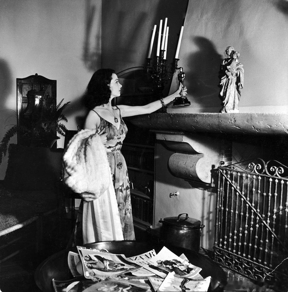 1940年费雯·丽和自己的奥斯卡小金人在家里拍摄的一张照片
