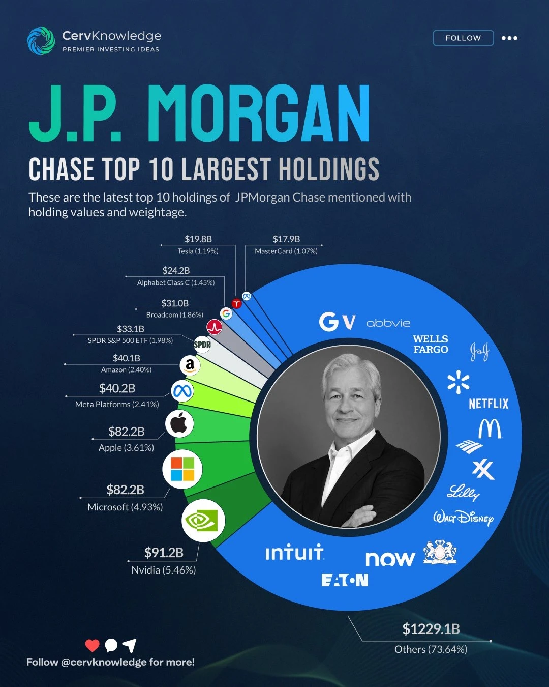 🏦 这张图展示的是摩根大通在最新披露中提到的前十大持有标的,核心目的是说明这家全球顶级金融机构,资金主要集中投向了哪些方向,以及这些配置背后的长期逻辑。
