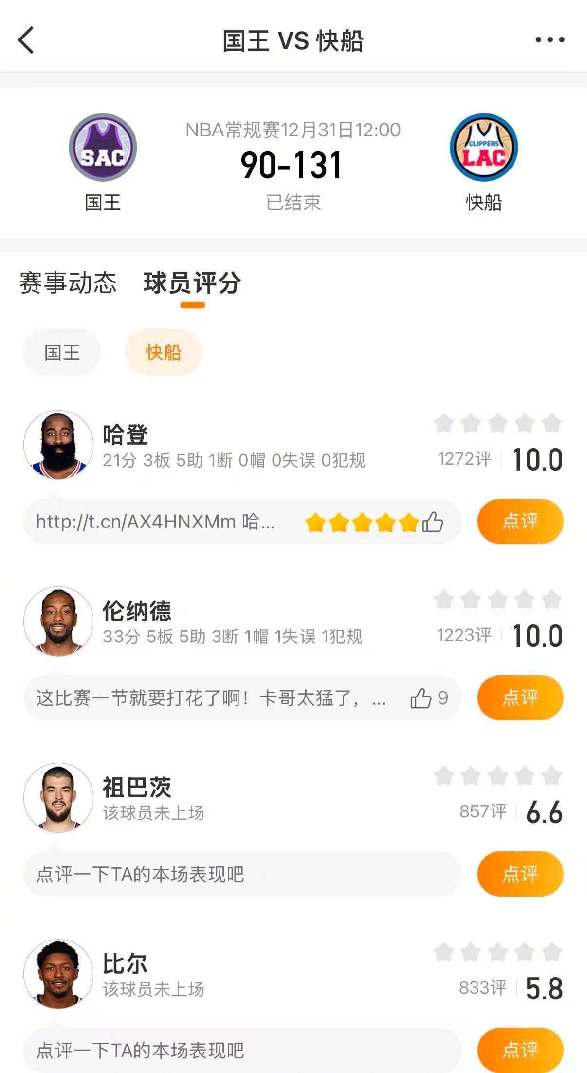 快船41分大胜国王 快船131-90大胜国王!伦纳德33分5篮板5助攻,哈登21分3篮板5助攻,科林斯16分。国王方面,克利福德18分,威少12分。欢迎大家进入球队超话洛杉矶快船萨克拉门托国王 给球员今日表现打分!