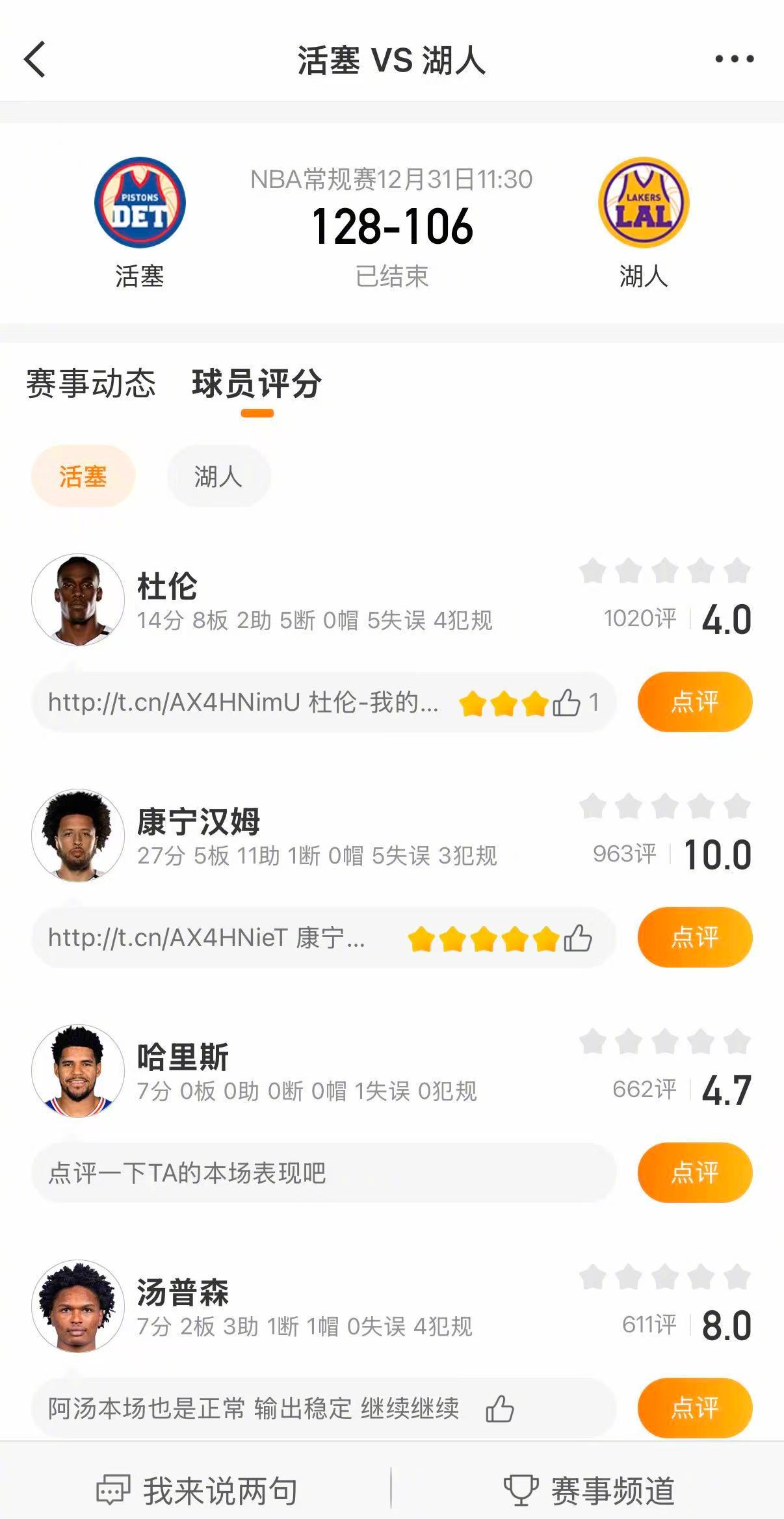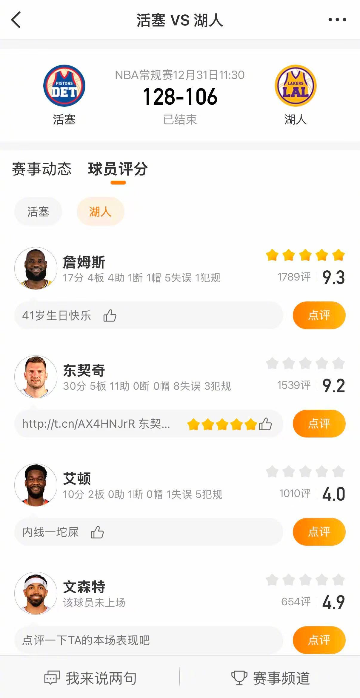 詹姆斯生日夜又输球了 活塞128-106战胜湖人,湖人末节崩盘,詹姆斯生日夜尝败果。坎宁安得到27分5篮板11助攻,杜伦14分8篮板。湖人方面,东契奇30分5篮板11助攻,詹姆斯17分4篮板4助攻,海斯13分。欢迎大家进入球队超话底特律活塞 和洛杉矶湖人 对球员表现进行评分!