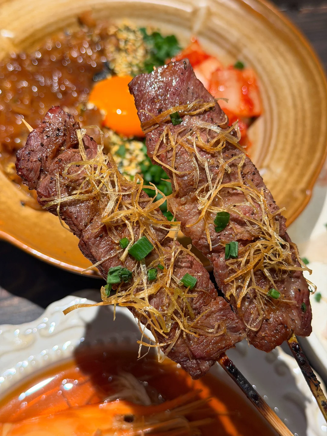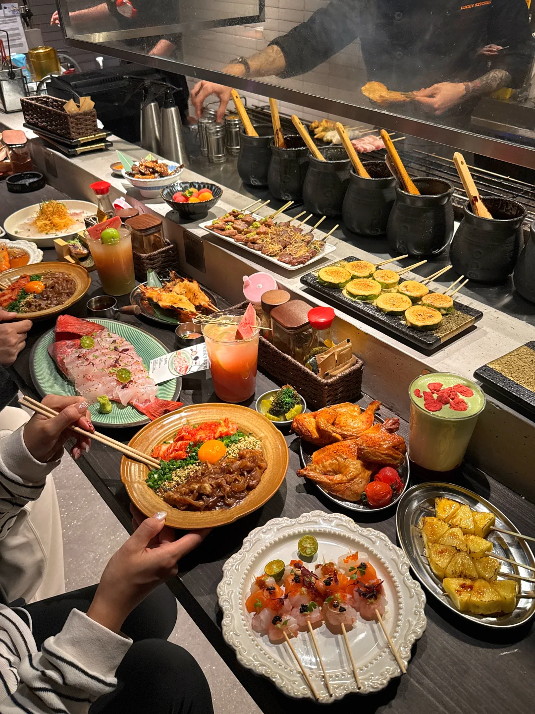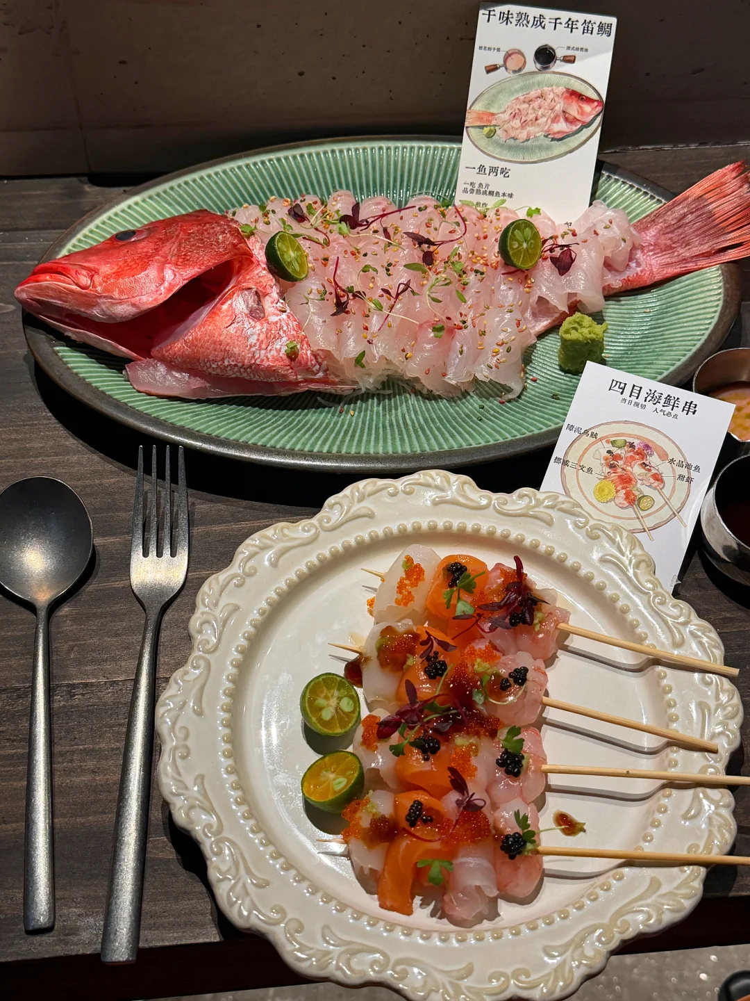 这周来吃第三次了!日系板前的氛围感! 主打湘味烧鸟,炭烤的调味好nice! 叫:好运厨房,就在运达里,地铁口边上。 每次必点泡菜肥牛拌饭、熟成千年笛鲷、四目海鲜、 明太子黑虎虾…都吼吼吃!饮品也巨好喝!!