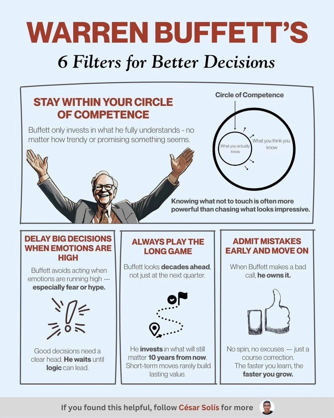 🧠 这张图总结的是 沃伦·巴菲特 在长期实践中反复使用的六个决策过滤原则。这些原则并不追求华丽技巧,而是帮助人在复杂环境中持续做出更高质量的判断,无论是在资产配置、商业选择,还是人生重大抉择上,都同样适用。