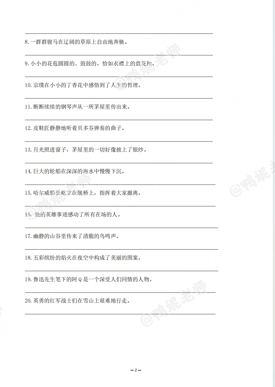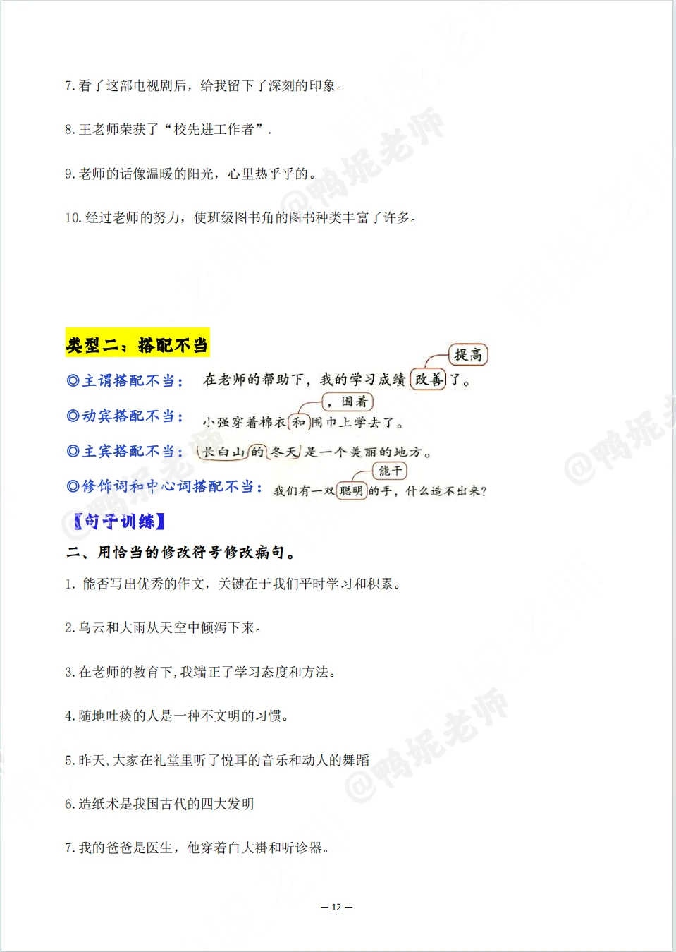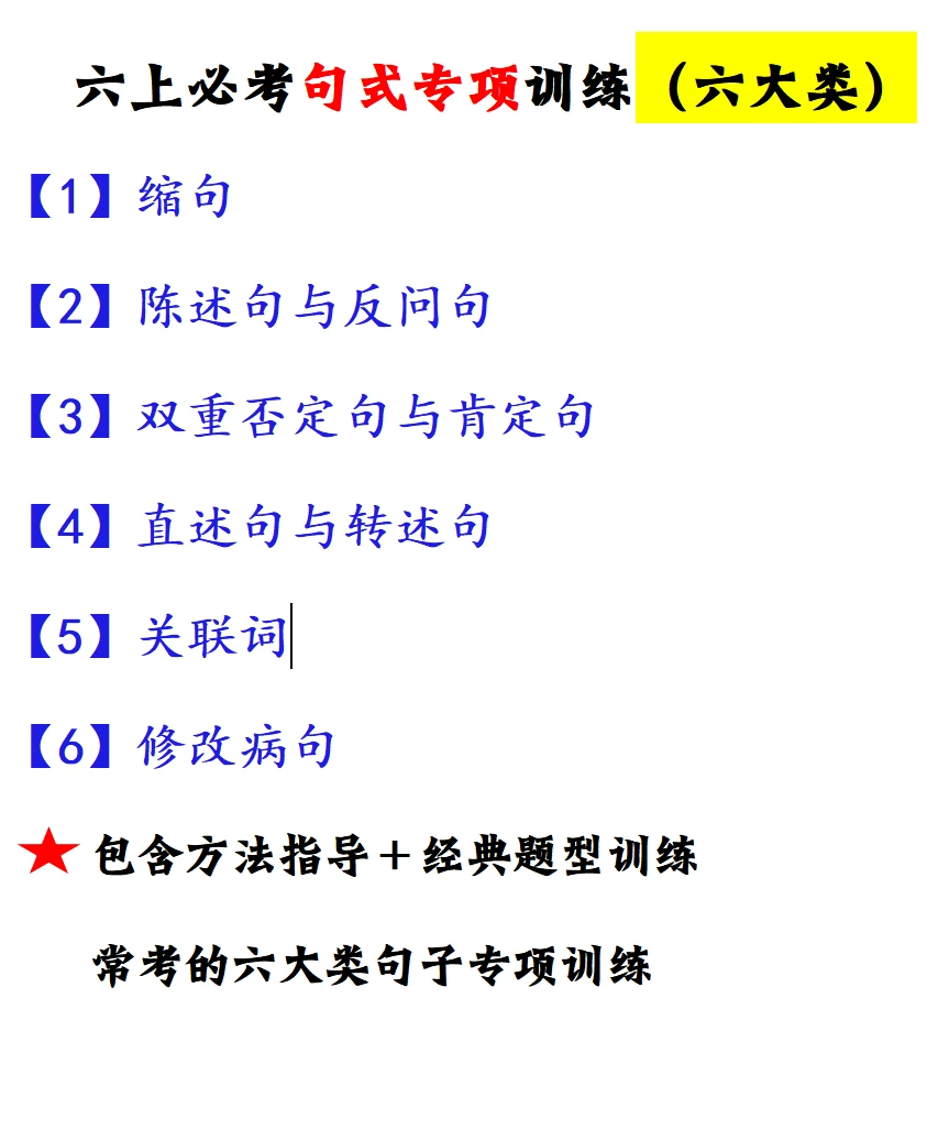 鸭妮老师精心整理的期末冲刺六上必考【句式专项】训练 [一R]缩句 [二R]陈述句与反问句 [三R]双重否定句与肯定句 [四R]直述句与转述句 [五R]关联词 [六R]修改病句(共8类病句类型) 空白版18页+答案6页(PDF电子资料) 包含方法指导+经典题型训练,孩子自己拿到资料自己就能练习!
