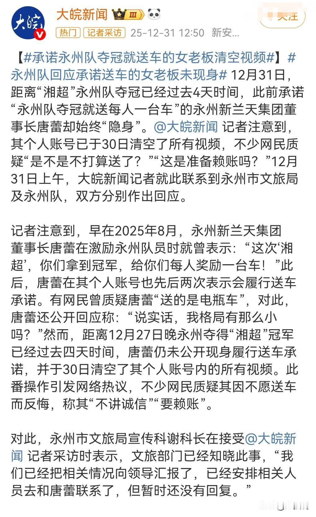 这女的也太不讲诚信了,之前说永州的如果得了冠军,每人送辆车,结果永州队真的得冠军了,这女的就隐身了,也不送车了,账号里的视频也清空了。 这种言而无信的人实在是太恶劣了。 话话不算话,竟然还是个董事长,这董事长这是一点也不懂事啊。 一定要追责。 说话像放屁一样怎么行啊?