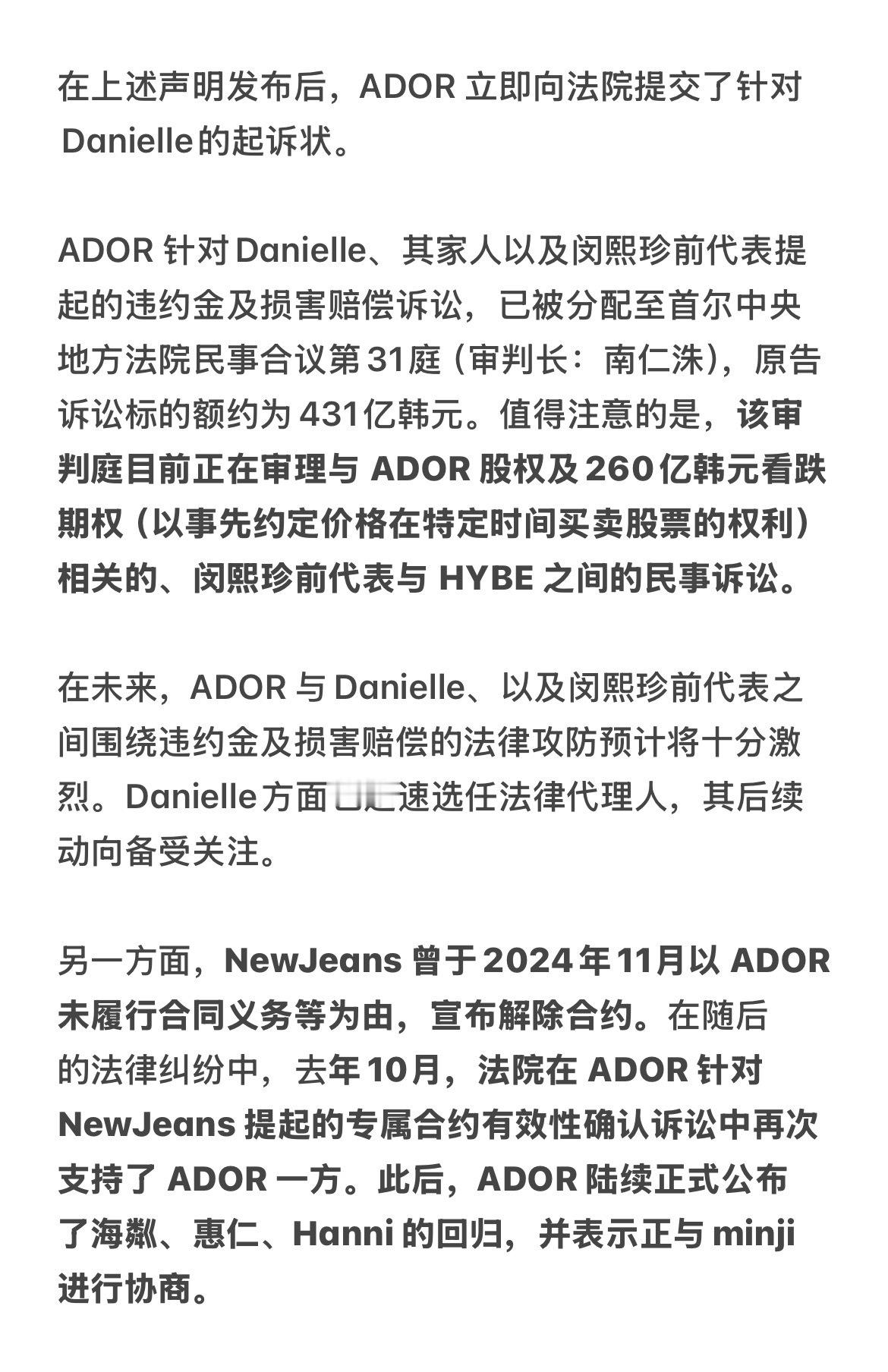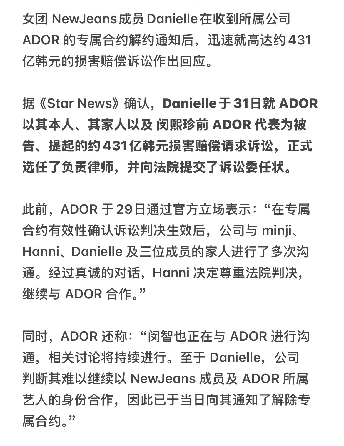 今日Danielle正面回应解约纠纷,启用律师并向法院提交了诉讼委任状,来应对ADOR对自己、家人以及前代表闵熙珍约431亿韩元(2亿+rmb)的索赔诉求。Danielle就431亿诉讼委托律师Danielle回应431亿诉讼