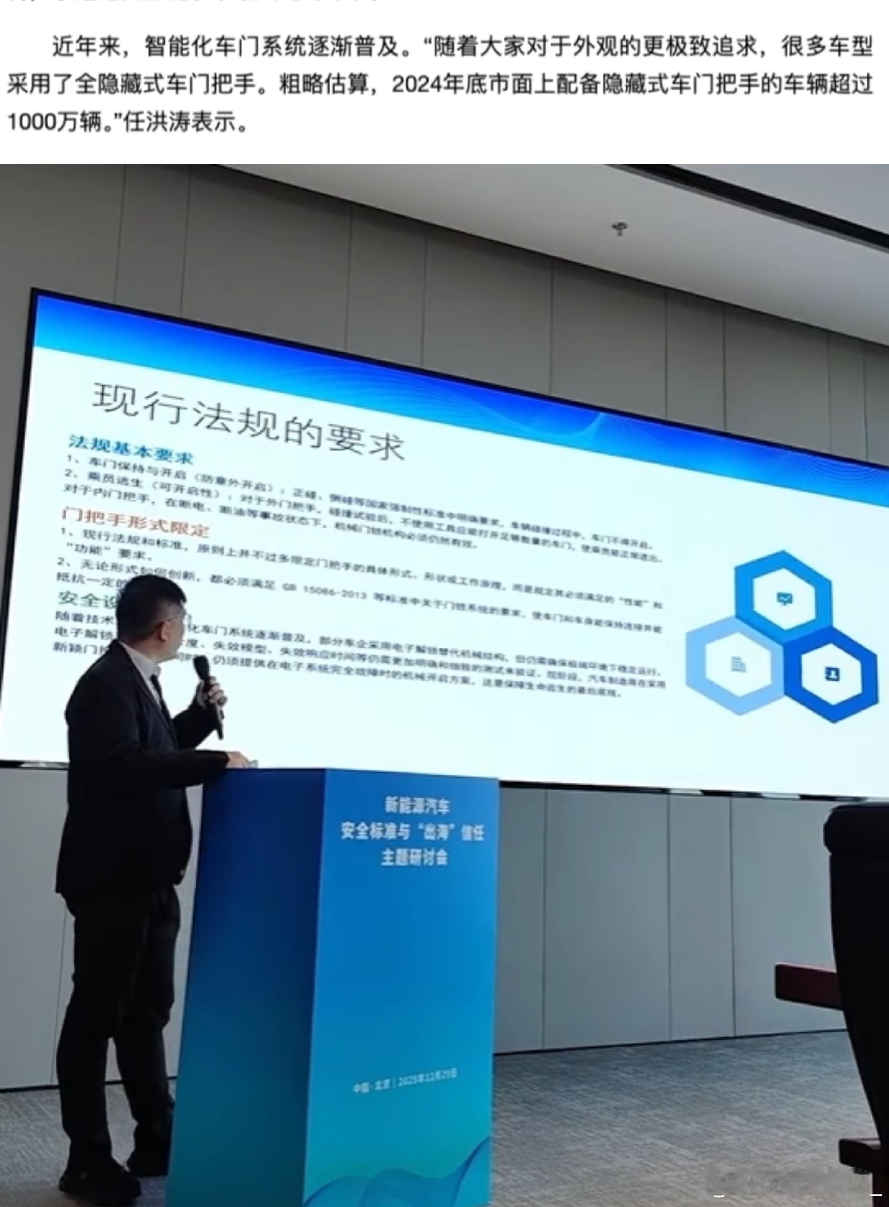 明确禁止全隐藏式门把手 2027年1月1日起,这种门把手可能要被淘汰了!(图一)中国汽研汽车安全技术中心粗略估算,2024年底市面上配备隐藏式门把手的车辆超过1000万辆,且每年还在以数百万辆的速度增加。(图二)如果不及时控制,恐怕后患无穷。不过比较幸运的是,已经有车企意识到相关问题,并提前作出对应改变,比如小米YU7就已经采用外部机械冗余设计。YU7的全隐藏方案更注重美观与低风阻,同时加入了多重安全备份机制,如机械拉线和备用电源,以应对极端情况。(图三)不过我觉得大家也不必太过焦虑,这有一定的限制条件的,在合法合规的车速下它完全符合国标的,中保研优级率已超 80%。另外,半隐藏/弹出式带机械冗余的版本没说要禁止,也不会对目前现有车辆造成影响。因为真正危险的是超速行驶。⚠️所以,当你看到这条送信息,你的车辆在此其中(图四),还是想提醒车主朋友们,一定要安全驾驶,不要超速哦。(图六)目前是属于公示阶段,大家可以提意见,2027年1月1日开始实施,留了一年的缓冲时间。我觉得小米YU7设计的就很不错,美观、低风阻且安全,大家觉得呢?(图七)(图八)汽车隐藏式门把手何去何从明确禁止全隐藏式门把手小米YU7小米yu7