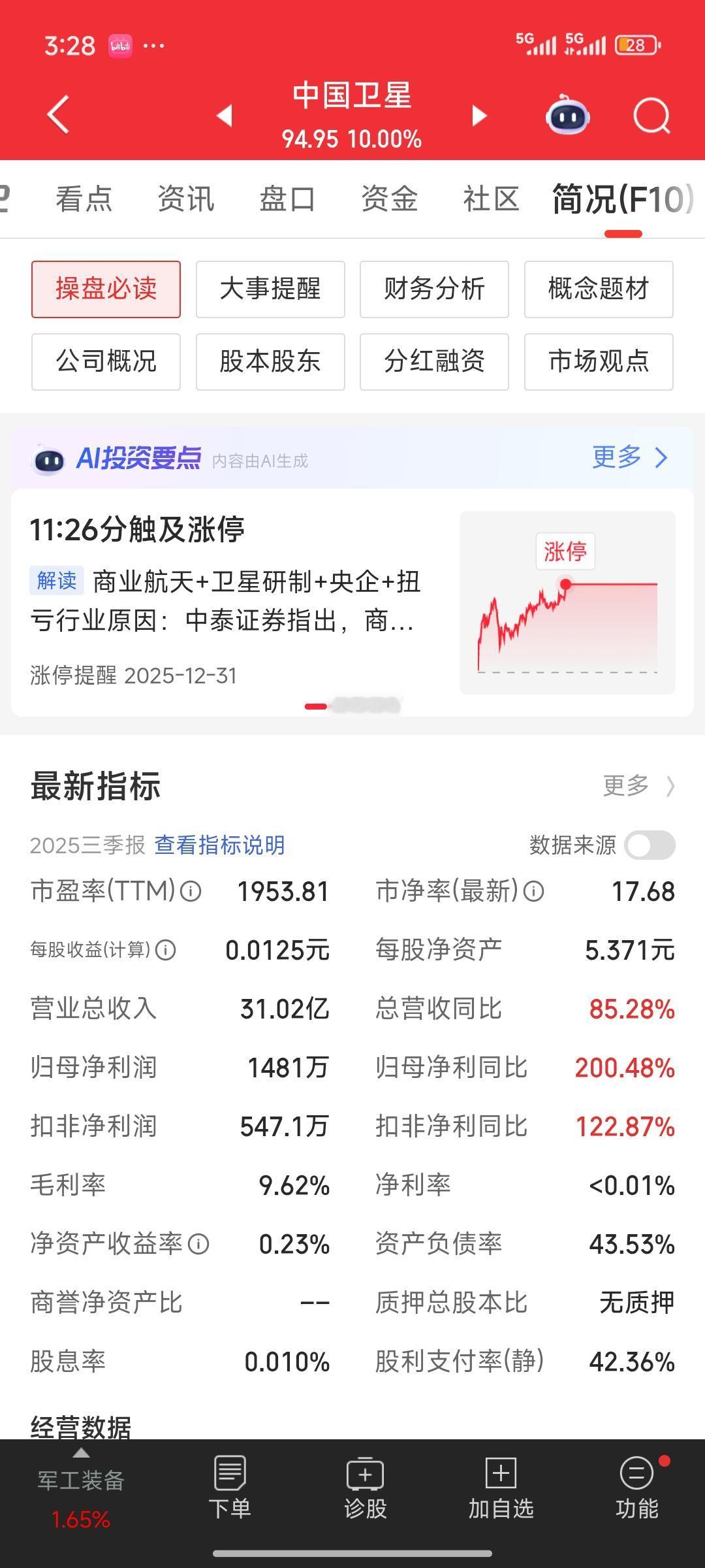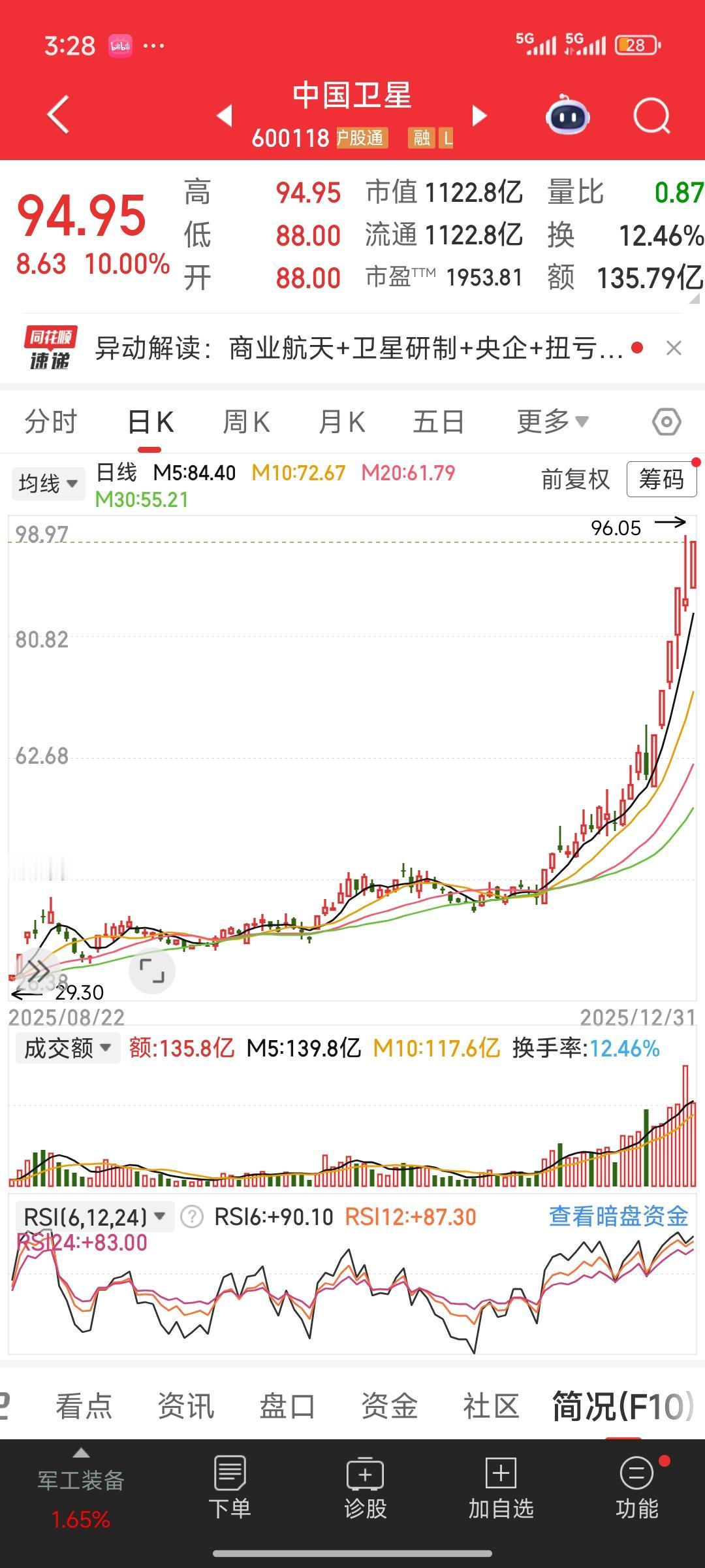 复盘来看,目前商业航天、航空航天领域最强的概念股当属中国卫星。在短短不到一个月的时间里,其股价已经从25元涨至接近100元,涨幅近4倍。更为惊人的是,近期它连续4个涨停,在昨天放量调整之后,今日再度涨停。目前其市盈率已达到一种梦幻盈利的状态。难道它真的要奔赴星辰大海了吗? 航空航天板块 航天概念股 中国商业航天 航天发展股票 航空航天概念股 中国航天的卫星 航天发展市值