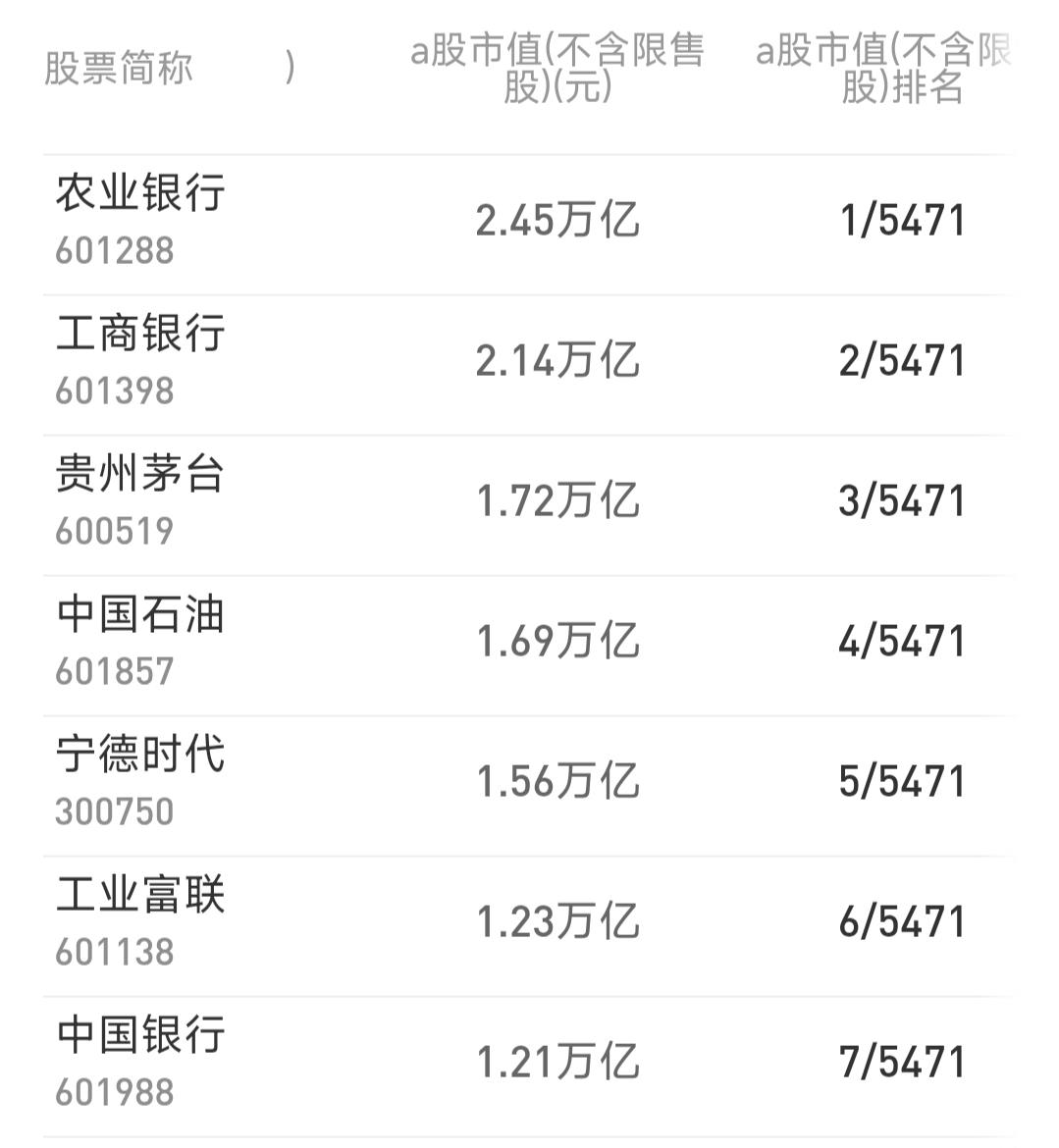 A股7家公司市值破万亿(流通市值) 2025年已经结束了,今年是妥妥的大牛市 太多股票涨幅翻倍,甚至涨了好几倍 散户今年的赚钱比例应该非常高 以下是万亿市值公司名单: 农业银行:2.45万亿 工商银行:2.14万亿 贵州茅台:1.72万亿 中国石油:1.69万亿 宁德时代:1.56万亿 工业富联:1.23万亿 中国银行:1.21万亿
