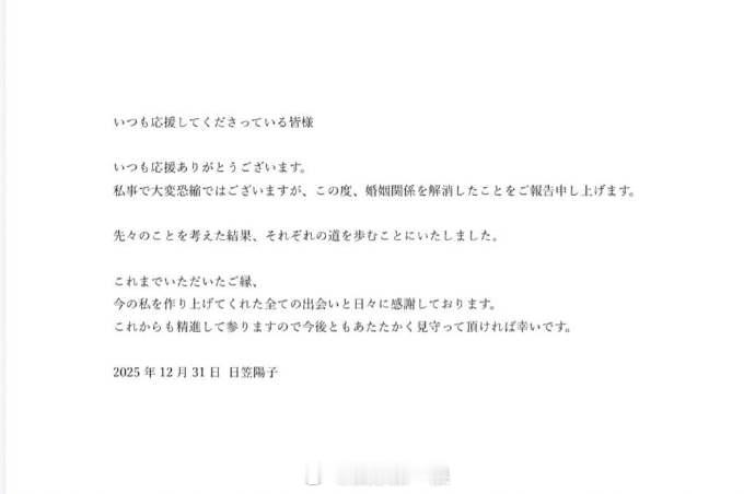 日笠阳子官宣离婚 日笠阳子官宣离婚。