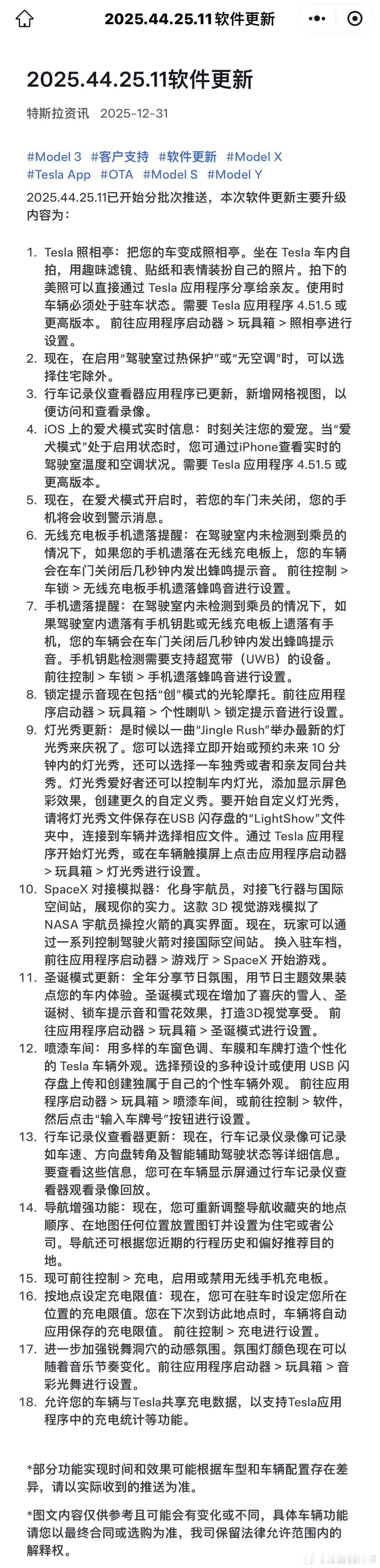 这次特斯拉 2025.44.25.11 软件版本OTA内容不少,从内容来看,涉及 18 项功能体验更新。特斯拉新能源汽车