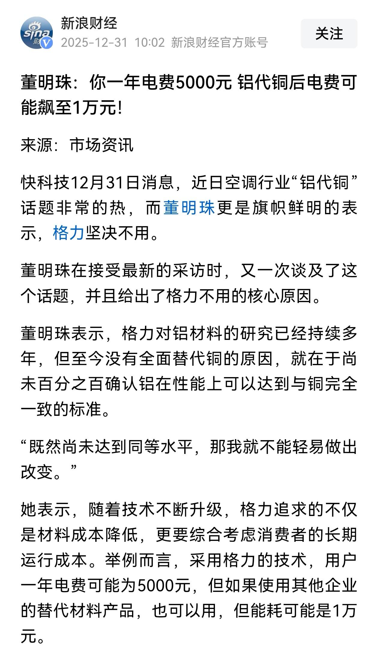 格力这波真的赢麻了,疯狂的宣传他们坚决不用铝,只用铜。不但特别标注他们用的是铜,还说铜管够。现在董明珠又说用铜能省一半的电费,这不是直接把其他品牌逼入了绝境吗? 我觉得格力可以再出一招,说不管铜价怎么涨,格力空调一律不涨价。通过这一波宣传,格力空调就牢牢占据了消费心智,它们用的是最好的铜材,最省电,最耐用,最划算,那其他品牌真的没路可走了。 对于老百姓来说,什么铜价大涨,卡脖子等等事情,他们不关心,他们只认最好的,最实惠的产品。