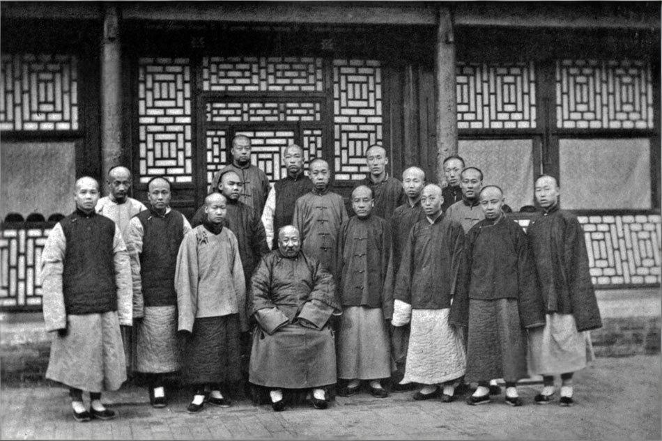 19世纪90年代初,北京京师同文馆,是晚清著名数学家、天文学家李善兰生前最后一张群体合影。 照片中前排中央端坐的是李善兰,后排与前排站立者多为同文馆天文算学馆的学生及部分教习,皆着清代袍马褂,剃发留辫。 1869年起,李善兰受聘为天文算学总教习(最高级教师),教授高等数学、微积分、天文等课程,直至1882年病逝。他在此期间培养了大批学生,如著名数学家华衡芳的学生辈,以及早期留美幼童中的数学人才。