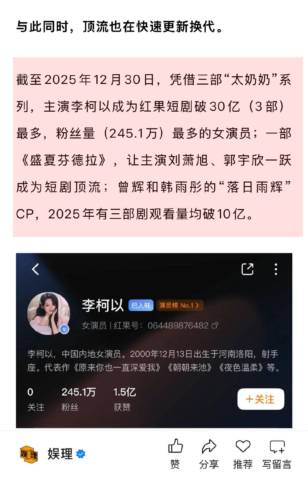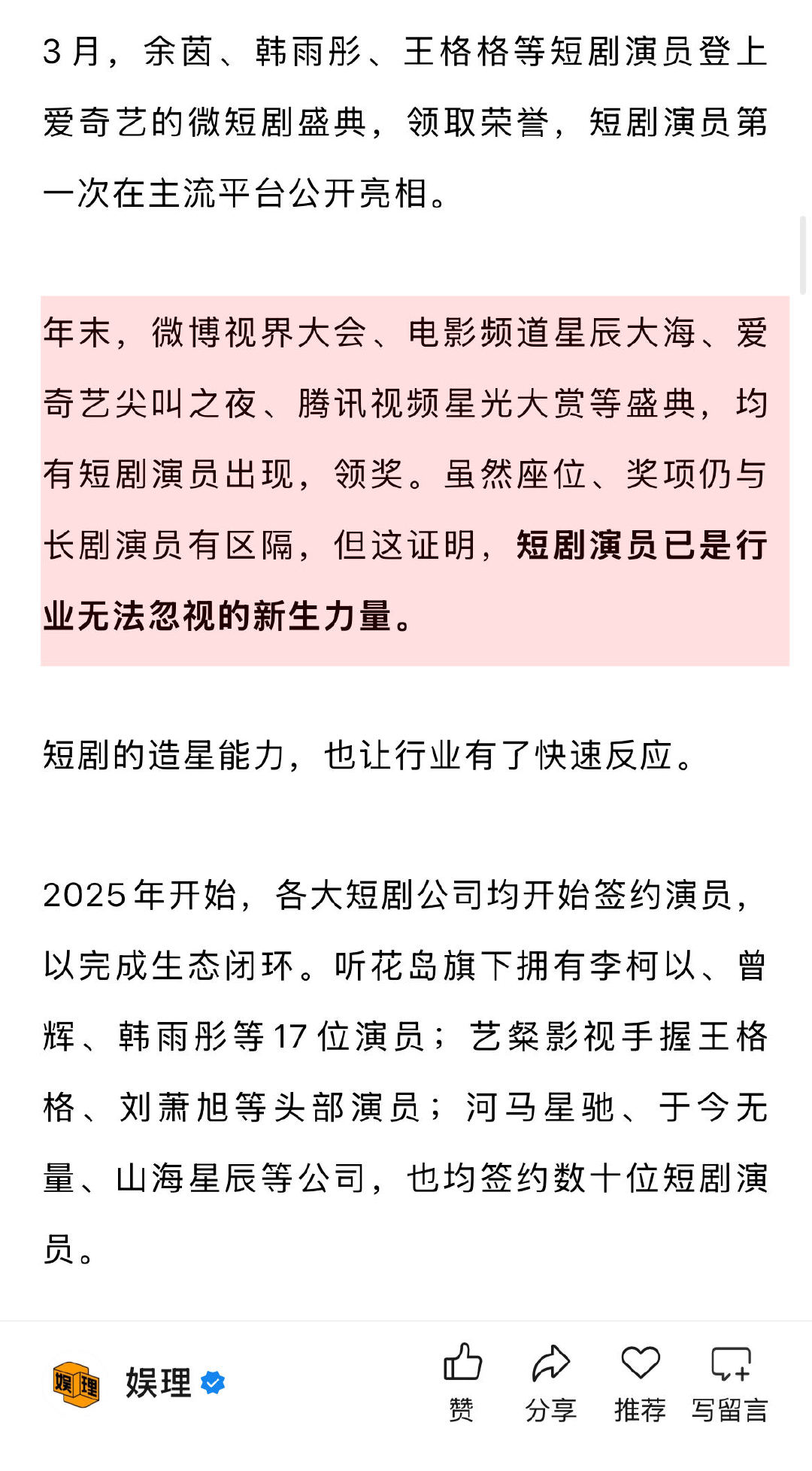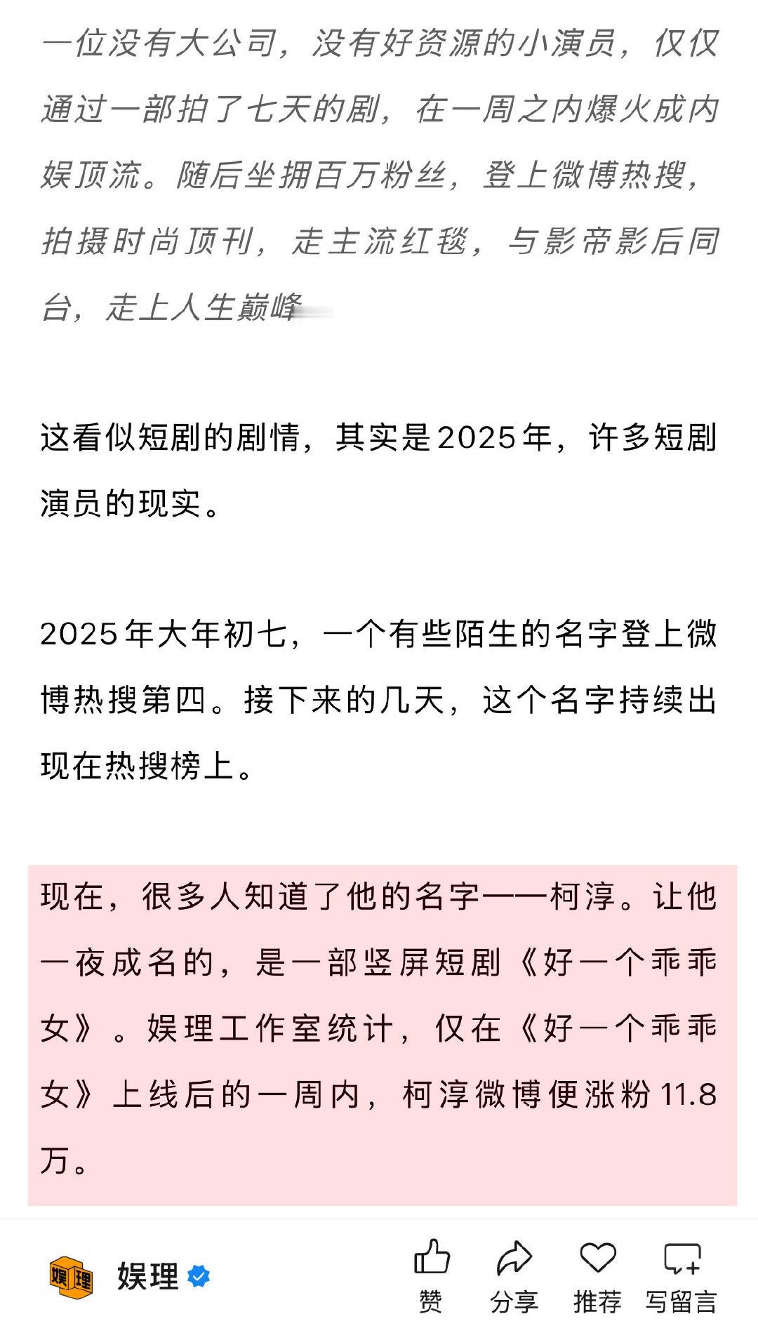 业内谈短剧演员上桌升咖 短剧精品化的关键是提高性价比 2025年大年初七,短剧演员柯淳随着《好一个乖乖女》的热播,持续出现在微博热搜榜上。据统计,仅在该剧上线后的一周内,柯淳微博便涨粉11.8万。2月,《时装男士》以“短剧F4”的身份,为短剧演员柯淳、马小宇、申浩男、何健麒拍摄合体大片,短剧初代“顶流”概念成立…娱理独家↓