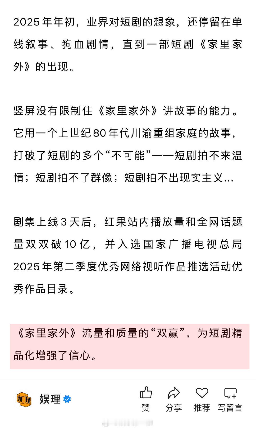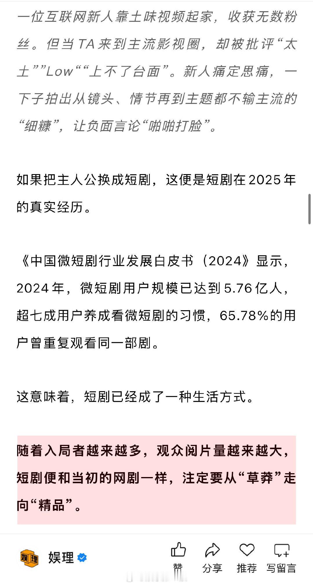 业内谈短剧演员上桌升咖 短剧精品化的关键是提高性价比 在精品短剧的路上,从业者们仍步履维艰。听花岛总制片人赵优秀体感最难的,是同行的制作速度太快,观众的口味变得太快,团队迭代的速度远远跟不上观众。在《好一个乖乖女》制片人李峻丞看来,精品不是一味地卷成本,很容易亏,而是要提高性价比…娱理独家↓
