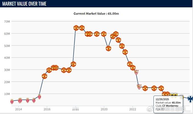 昨日德转更新墨西哥超球员身价,现效力于蒙特雷的马夏尔身价下跌至600万欧。今年9月马夏尔从希腊球队雅典AKE转会至蒙特雷,转会费100万欧。在过去的4个月时间里,马夏尔仅代表蒙特雷出战12场,2次首发,没有进球和助攻。十年前马夏尔以6000万欧的高价从摩纳哥转会加盟曼联,在曼联效力期间,马夏尔的身价最高曾达到6500万欧。2024年夏天,马夏尔自由身离开曼联加盟雅典AKE,自此淡出球迷视野。曼联足球