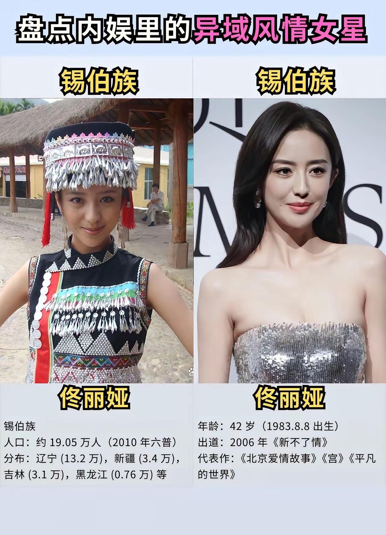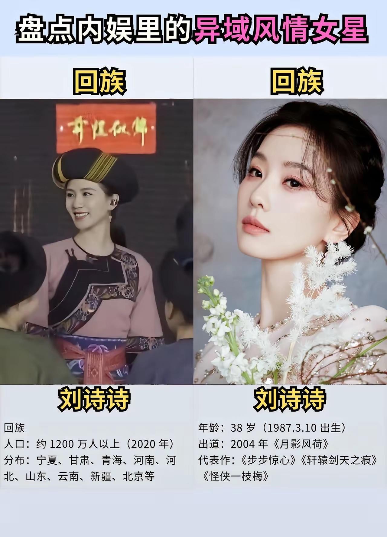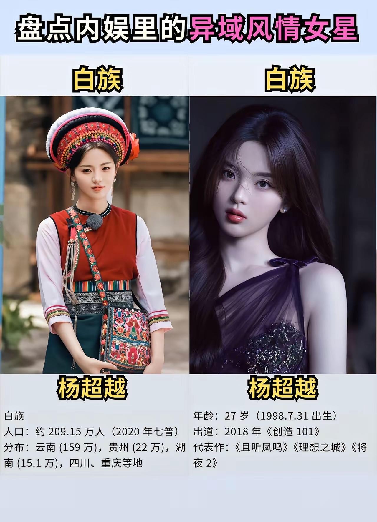 什么才是真正的异域风情 我觉得你应该认识一下这些女明星 她们不仅仅长相甜美漂亮,而且还特别的擅长载歌载舞,遇见这样的女孩子应该没有人会不喜欢吧。 来自新疆维吾尔族的迪丽热巴,她的长相绝对是让人无可挑剔的,2013年出道的她扮演过各种各样的角色,她出演的《三生三世十里桃花》《克拉恋人》等作品也是都是备受观众们的好评与认可的,这些年她的演技也在不断提升。 来自回族的刘诗诗,曾经的她以刘亦菲的替身出道,然而现在的她也早就成为妥妥的一线大明星,这些年以来她出演的作品真的不算少了,《仙剑奇侠传》《怪侠一枝梅》《步步惊心》等作品也都有她的身影。 来自白族的杨超越,她的人生绝对是极其幸运的,能够从一个籍籍无名的普通人,一步步成为娱乐圈大红大紫的明星,她的人生不可谓不精彩。 不得不说,她那甜美的长相真的在无形之中帮助了她很多,这些年来她出演的作品有《将夜》《理想之城》等,毕竟她不是科班出身的所以她的演技还是需要打磨的。