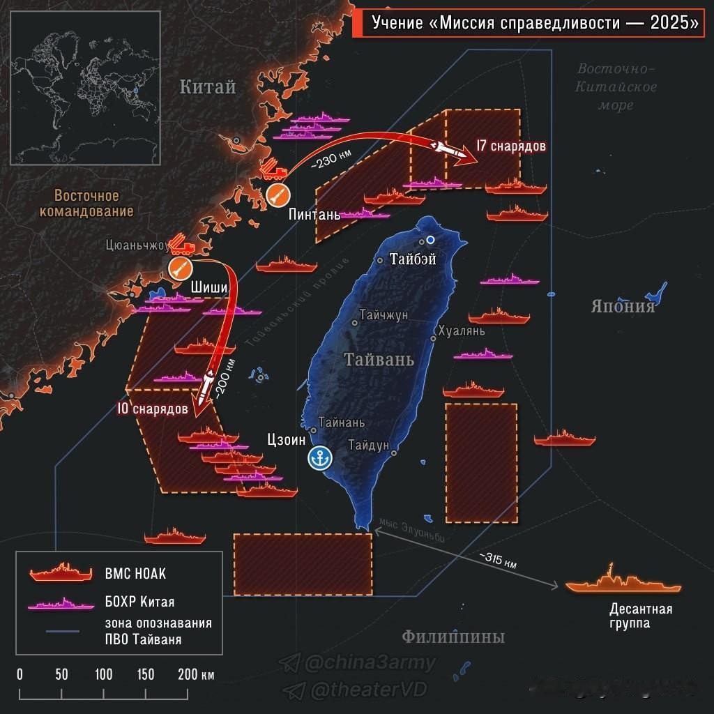 🚚🇨🇳向补给船进行齐射——俄媒报道 🔻 “正义使命2025”演习第二天结束后,解放军地面部队针对模拟美国及盟国货船目标进行的实弹射击演习结果总结如下。这些货船用于在台湾遭受中国大陆封锁时向台湾运送物资、武器和后勤补给。 射击结果 🌟 • 第72集团军第1导弹炮兵旅:莫斯科时间凌晨4点,从平潭地区发射场发射了17枚PCL-191型多管火箭炮。弹头落点位于台湾基隆东北130公里处。估计射程为230公里。 • 中国第三军第73集团军炮兵旅:莫斯科时间上午8:00,从石狮/泉州地区的发射场发射了10枚PCL-191型多管火箭炮。弹头落点位于台湾台南西南93公里处。估计射程为200公里。