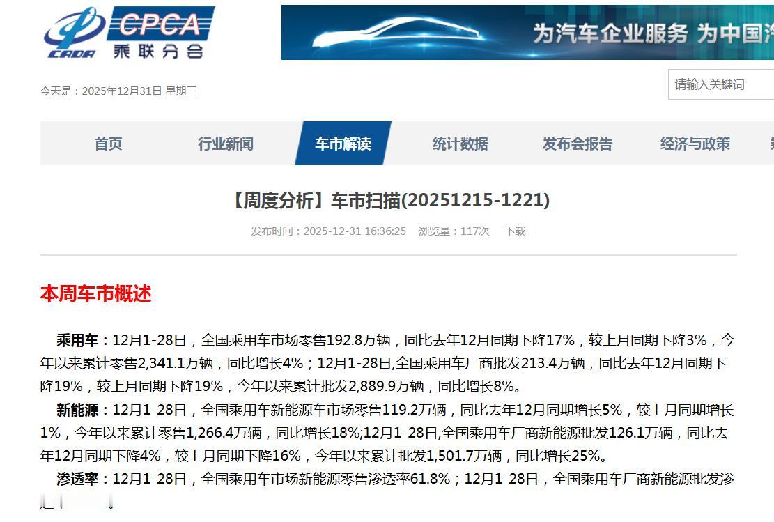 12月汽车销量下滑17%!年度累计增长4% 12月1-28日,全国乘用车市场零售192.8万辆,同比去年12月同期下降17%,较上月同期下降3%,今年以来累计零售2,341.1万辆,同比增长4%;12月1-28日,全国乘用车厂商批发213.4万辆,同比去年12月同期下降19%,较上月同期下降19%,今年以来累计批发2,889.9万辆,同比增长8%。 新能源:12月1-28日,全国乘用车新能源车市场零售119.2万辆,同比去年12月同期增长5%,较上月同期增长1%,今年以来累计零售1,266.4万辆,同比增长18%;12月1-28日,全国乘用车厂商新能源批发126.1万辆,同比去年12月同期下降4%,较上月同期下降16%,今年以来累计批发1,501.7万辆,同比增长25%。 渗透率:12月1-28日,全国乘用车市场新能源零售渗透率61.8%;12月1-28日,全国乘用车厂商新能源批发渗透率59.1%。【来自懂车帝车友圈】