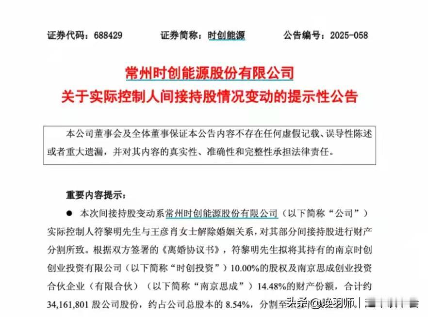 4.46亿天价离婚刷屏!一家亏损的光伏小公司,为何分手费如此高昂?天价离婚案发生后,时创能源股价在2025年12月31日收于13.09元,与前一交易日基本持平。 公司公告显示,截至披露日,这次间接持股变动涉及的过户相关手续尚未完成。 对于普通投资者而言,上市公司实控人的婚姻状况变化值得关注,但更重要的是企业的基本面和长期发展潜力。在光伏这个技术驱动型行业,技术创新和产业化能力才是决定企业价值的核心要素。光伏公司跑路 光伏退市 光伏爆雷 光伏竞价 二手光伏板 光伏破产 光伏掉价