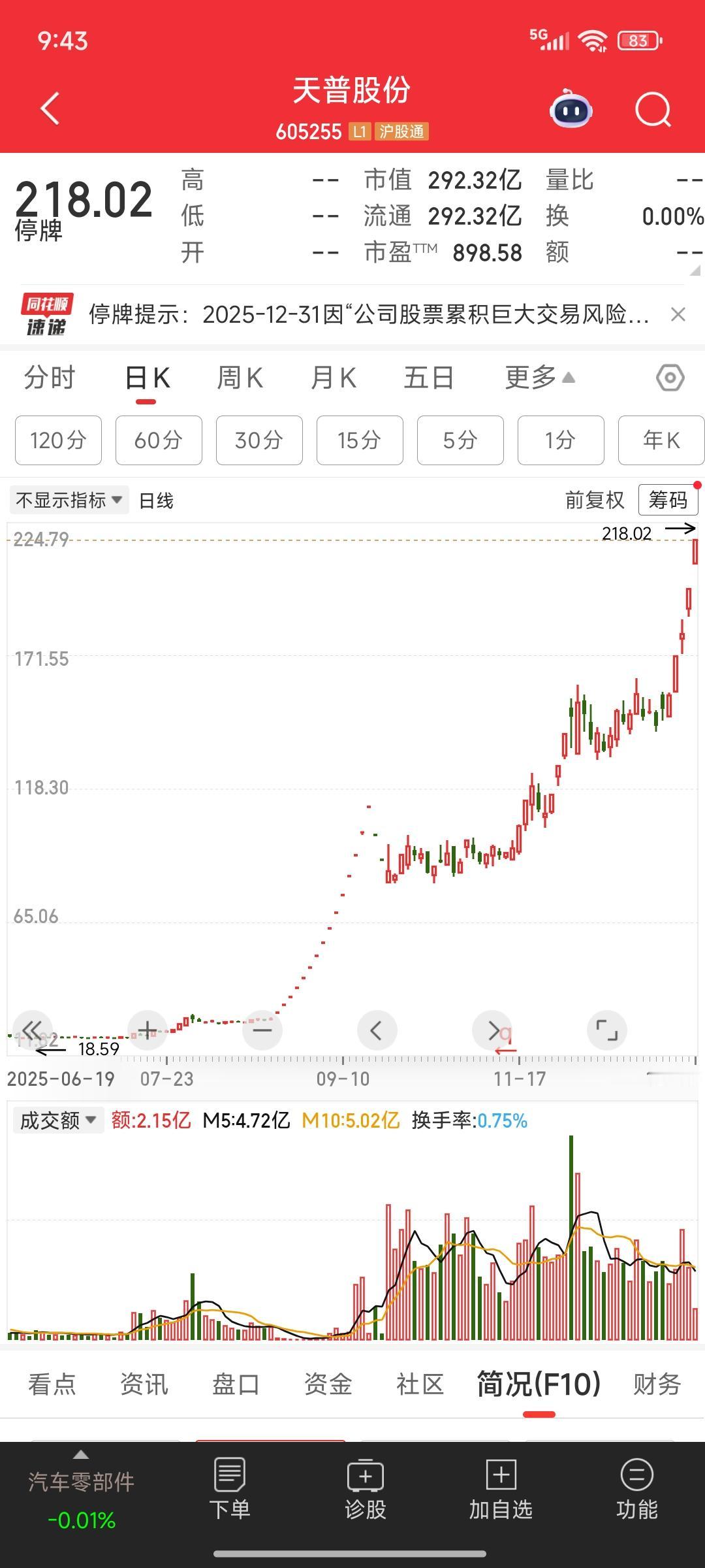 天普股份涉嫌信息披露违规 收到监管工作函 上交所12月31日向天普股份下发监管工作函,涉及对象为上市公司,董事,高级管理人员,控股股东及实际控制人;处理事由为关于宁波市天普橡胶科技股份有限公司涉嫌信息披露违规的监管工作函。 经常看公告的散户应该知道 监管工作函并不是很大的利空 股价一般不会因此大幅波动 可是天普股份不一样,股价涨幅太大了 资金抱团炒作,丝毫没有减弱的迹象 那么裁判到底给市场传达什么样的信息 想必大家心里有数了吧 股价从26.57一路飚到218.02 涨幅720.55%,市值292.32亿 收购方中昊芯英,本身的估值也就44亿多 所以天普股份的泡沫超级巨大 目前股票仍在停牌,市场会如何反应 只有耐心等待复牌了