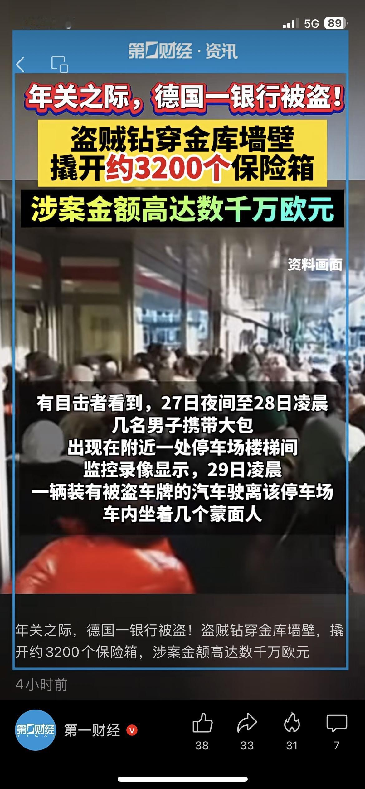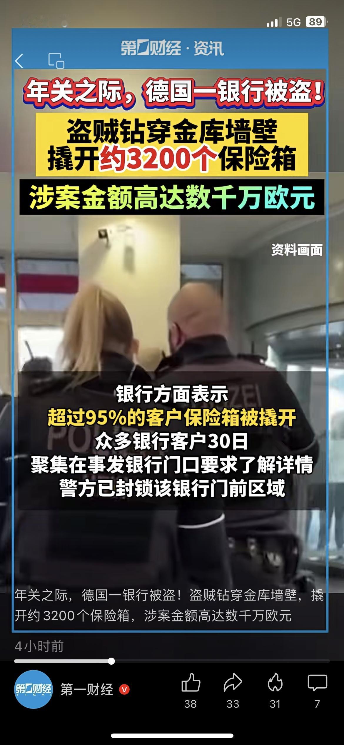 年关了,去银行存贵重物品的朋友注意了! 德国一银行遭盗窃,盗贼钻穿金库墙壁撬开3200个保险箱,涉案金额最高达9000万欧元,蒙面嫌犯还驾车逃离了现场。 我上周刚去银行问过保险箱业务,工作人员说普通保险箱只保管不承保,丢了大概率只能自己承担损失。 年关防盗不仅要防家门,贵重物品存放也得留个心眼,别觉得放银行就万无一失。 你会把贵重物品存银行保险箱吗? 你知道银行保险箱被盗能理赔吗? 资产安全
