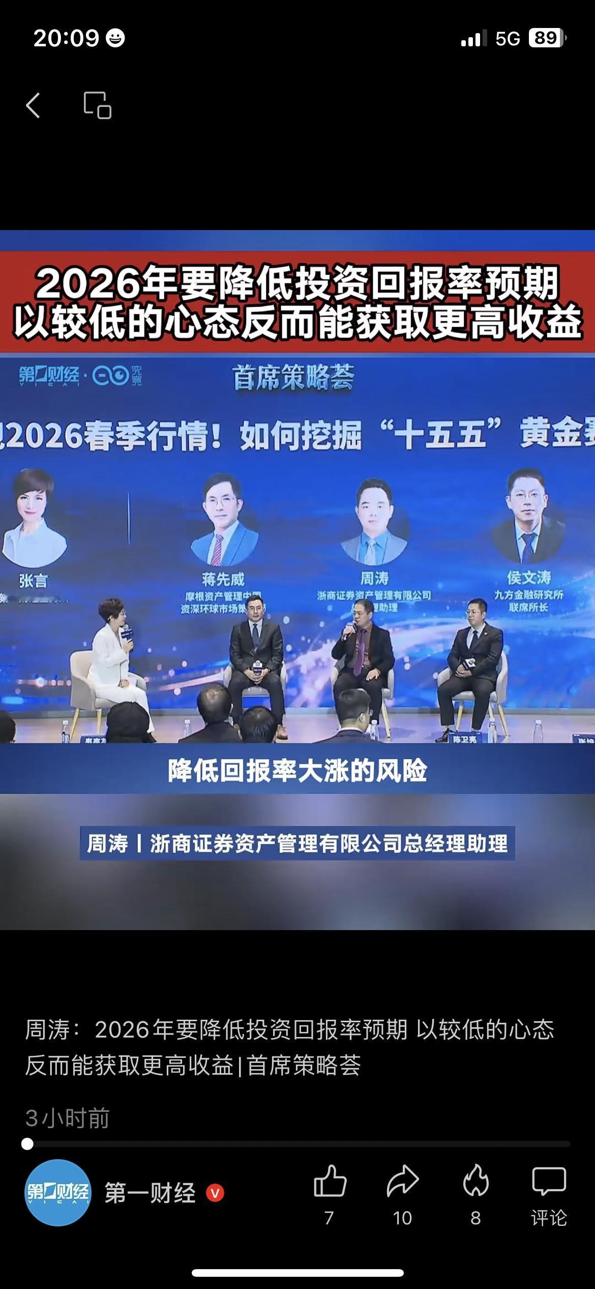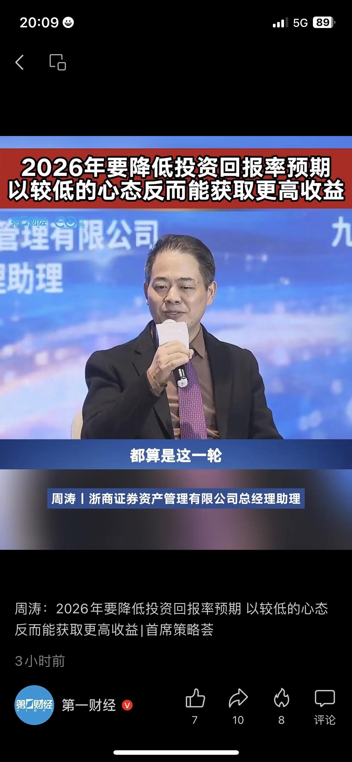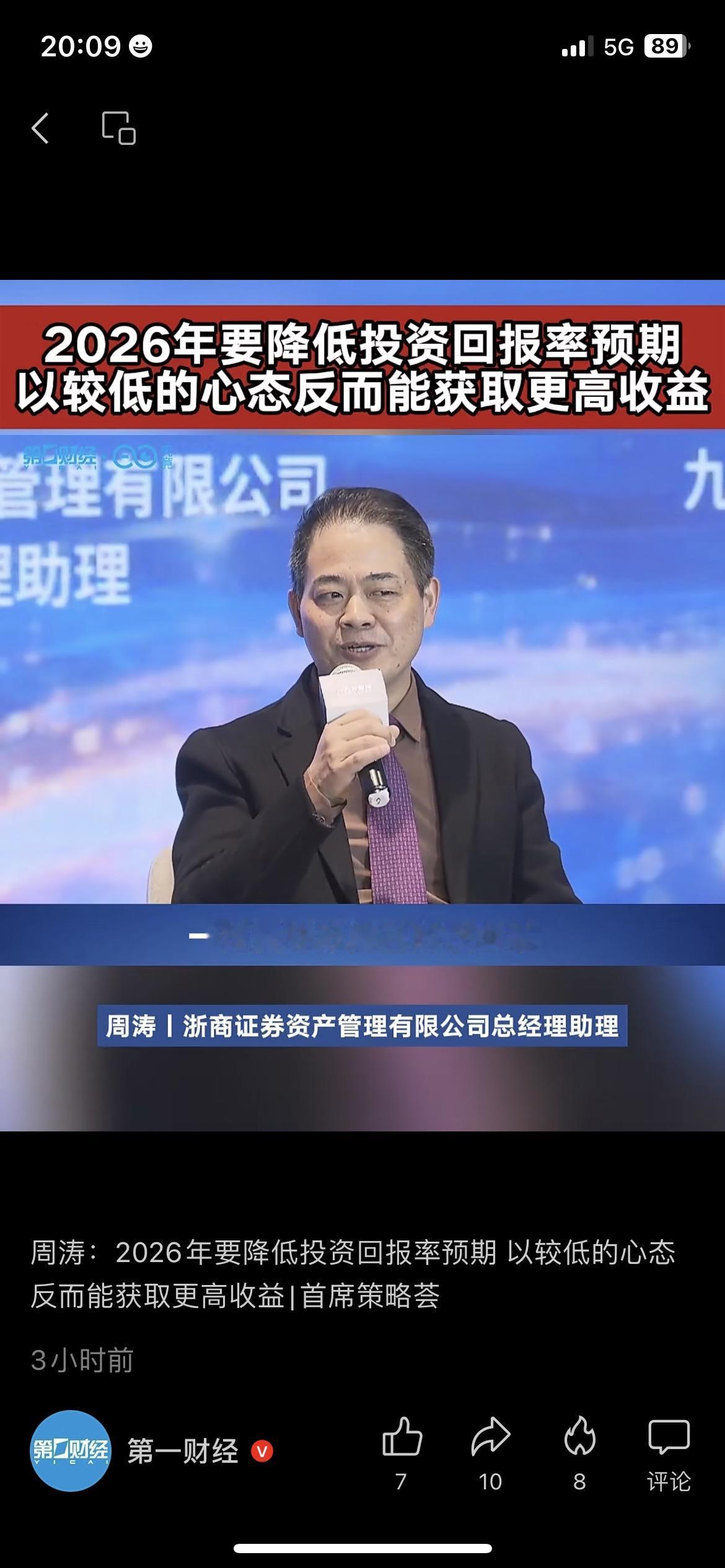 朋友去年追高基金亏了两万,财经大佬的话点醒了他! 浙商证券资管周涛说,2026年要降低投资回报率预期,心态放低反而能赚更多,盲目追高只会亏本金。 朋友之前总想着一年赚20%,结果踩了好几个坑,现在他把预期降到5%,只买稳健理财,反而没再亏过。 普通人理财别被高收益冲昏头,稳一点比啥都重要。 你2026年的投资预期是多少? 你有没有因为高预期亏过钱? 2026投资攻略 财经干货基金指数