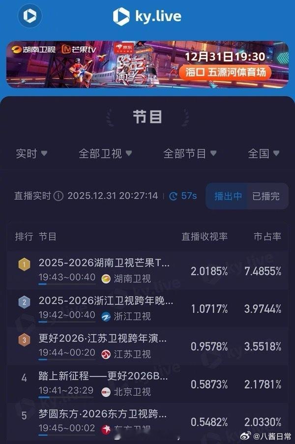 湖南台跨年晚会收视率领先一截