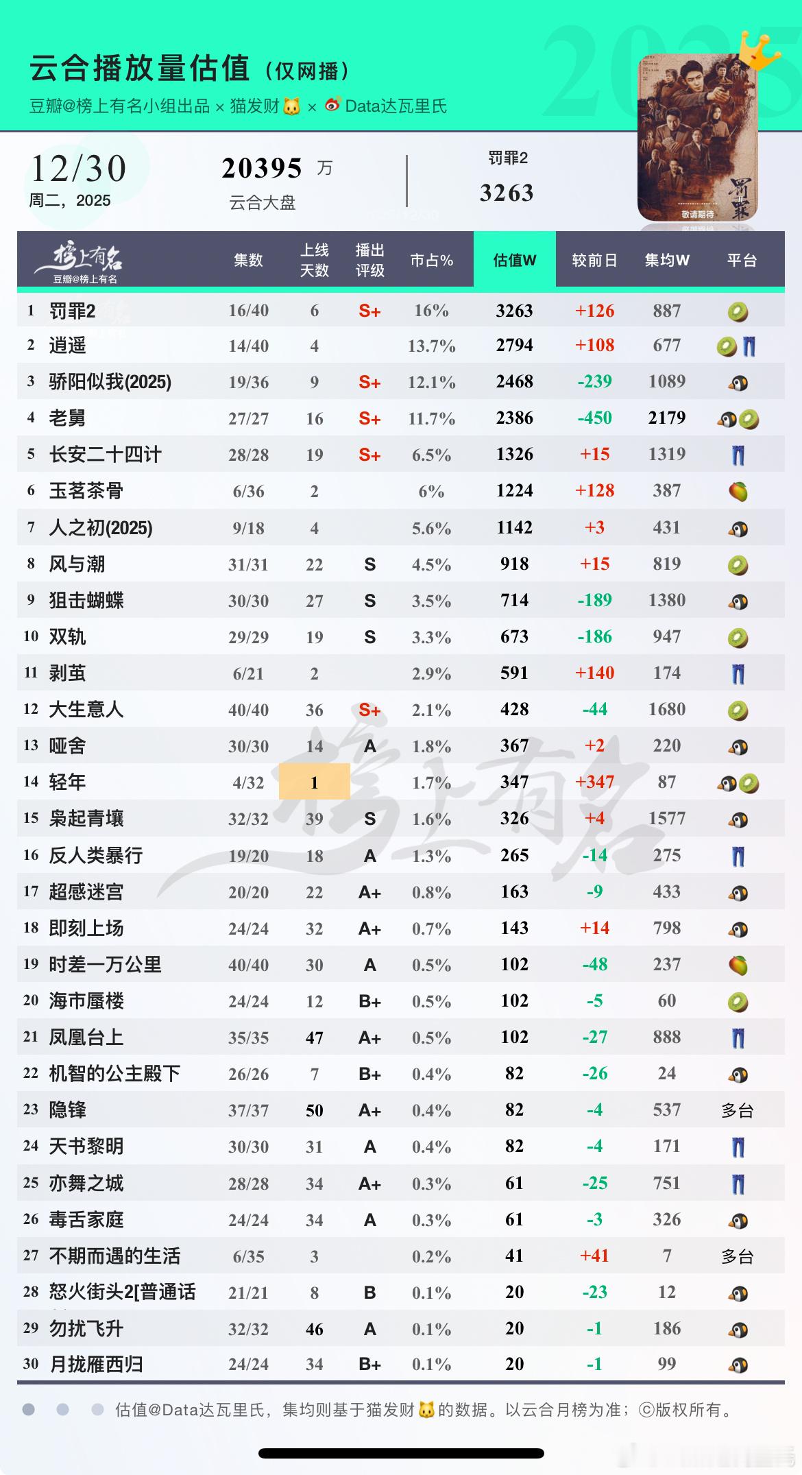 12.30云合估值🌴豆瓣榜上有名小组出品所有剧播放量都横盘了,涨幅不大罚罪2 涨126万,有横盘迹象,日更二集如果不能继续🛫集均估计只有2500+万逍遥 涨100来万横盘迹象骄阳似我 单集更降200多万也不妙玉茗茶骨 次日涨100多万这数据太扯淡……电视剧人之初 挣扎不了,必扑局了剥茧 次日不到600万,涨幅140万十分不妙轻年 首播不到400万,扑开轻年数据 ,剥茧数据 ,骄阳似我数据 ,罚罪2数据 ,赵丽颖逍遥戏外赵丽颖逍遥戏外