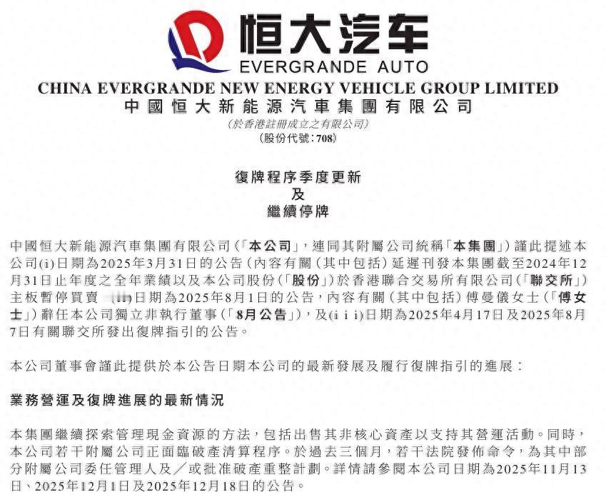 没想到恒大汽车还活着,自从许老板进去之后,再也没听到恒大汽车的各种造势新闻了。不过,即便还活着,也是半死不活。 12月31日,恒大汽车发了一份公告,大概的意思是现在没钱了,连个会计审计机构都请不起,导致2025年6月30日止六个月之中期业绩延迟刊发。所以,准备卖点非核心资产,来维持运营活动。 恒大汽车还有什么非核心资产吗?核心资产都不值几个钱了吧?严重资不抵债,谁要啊。之前几次说在寻求买家,一直都没消息,说明没人愿意接这个烂摊子。 恒大汽车之所以还没倒闭,是因为母公司恒大集团还活着。而恒大集团还活着,是因为保交楼任务还没完成。一旦这些结束了,恒大集团和恒大汽车就是走向破产了。 许老板作为大股东,股份肯定是作废了,现在还要他把钱吐出来。