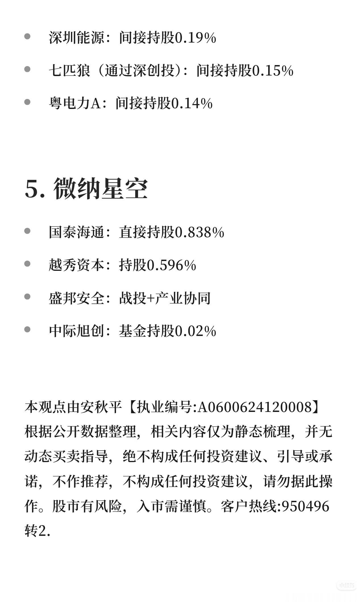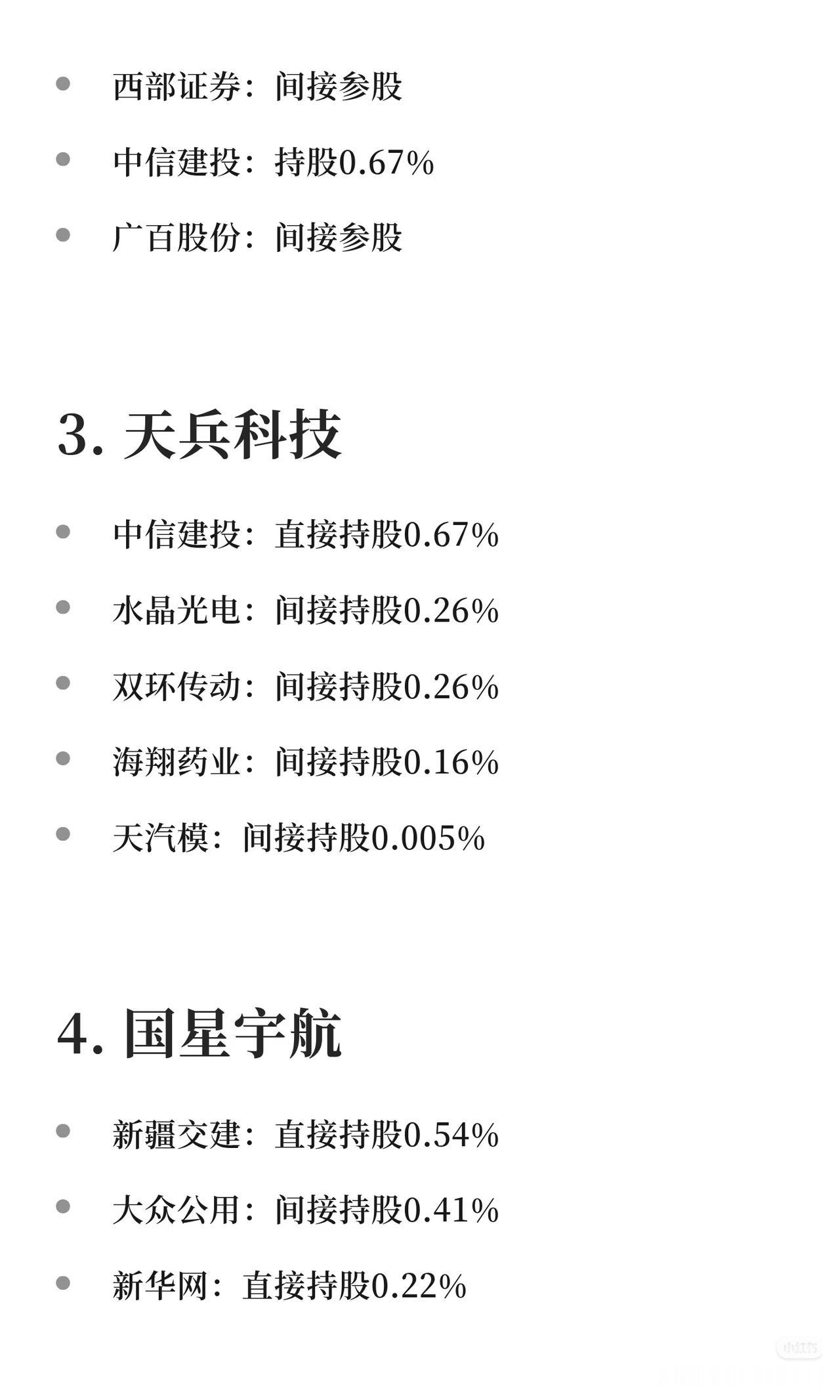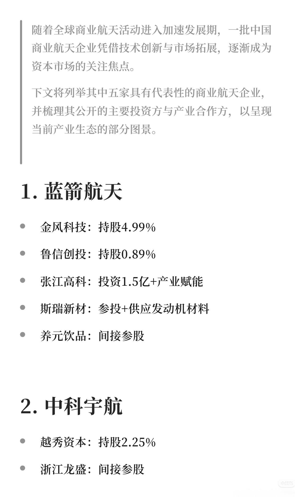 中国商业航天产业快速发展,五家“独角兽”企业——蓝箭航天、中科宇航、天兵科技、国星宇航、微纳星空——即将上市,吸引众多知名资本和产业公司参股或合作,形成紧密的产业与投资生态。 各企业及主要投资方/合作方(仅列代表性持股情况): 1. 蓝箭航天 - 金风科技(持股4.99%) - 鲁信创投(持股0.89%) - 张江高科(投资1.5亿+产业赋能) - 斯瑞新材(参投+供应发动机材料) - 养元饮品(间接参股) 2. 中科宇航 - 越秀资本(持股2.25%) - 浙江龙盛(间接参股) 3. 天兵科技 - 中信建投(直接持股0.67%) - 水晶光电、双环传动(均间接持股0.26%) - 海翔药业(间接持股0.16%) - 天汽模(间接持股0.005%) 4. 国星宇航 - 新疆交建(直接持股0.54%) - 大众公用(间接持股0.41%) - 新华网(直接持股0.22%) 5. 微纳星空 - 国泰海通(直接持股0.838%) - 越秀资本(持股0.596%) - 盛邦安全(战略投资+产业协同) - 中际旭创(基金持股0.02%) 此外还有深圳能源、七匹狼(通过深创投)、粤电力A等间接参股相关企业。 关键信息: - 多家上市公司通过直接投资或产业合作参与商业航天赛道。 - 资本背景多元,涵盖券商、制造业、能源、传媒等领域。 - 信息仅供静态梳理,不构成投资建议,需注意股市风险。