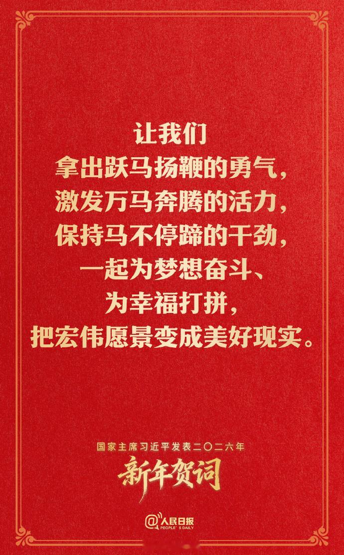 【这3个带马成语太给劲了】新年贺词让我们拿出跃马扬鞭的勇气,激发万马奔腾的活力,保持马不停蹄的干劲,一起为梦想奋斗、为幸福打拼,把宏伟愿景变成美好现实。2026年新年贺词