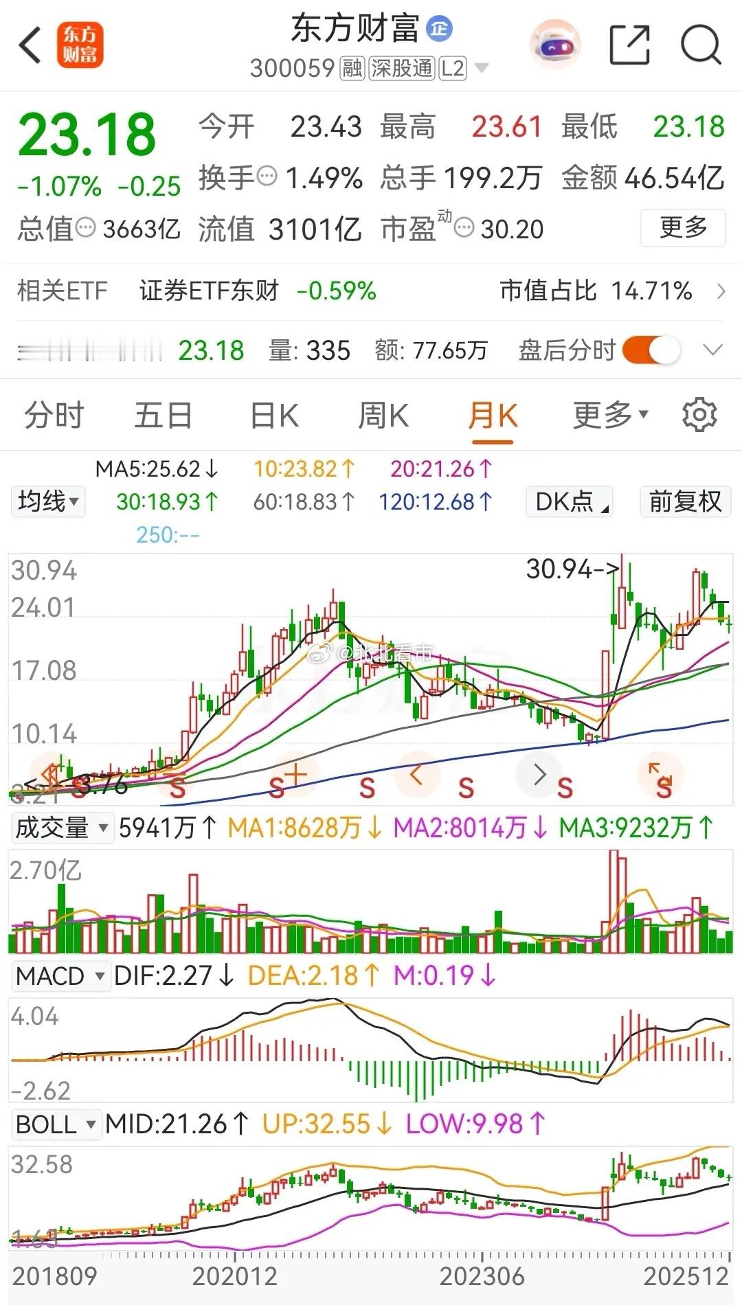 东方财富今日平开后冲高回落,收盘时跌了1.07%,收盘报价为23.18元,被主力资金净卖出了5.4394亿元,月线收出一颗阴十字星,目前是连续四个月收出阴线。今天是年底收官之日,很遗憾今年以绿盘报收,年跌幅为10.02%,当前的总市值为3663亿元。下面简单说说今天的详细走势和年内的整体走势情况。东方财富今天平开震荡后突然直线拉升起来,冲高后震荡回落,午后则是进一步走弱,最终收报于最低价。在资金流向上,今天被主力资金净卖出了5.4394亿元,已是连续三天净卖出,而近五个交易日得合计净卖出额为6.77亿元。从走势上看,自从12月05日的放量中阳线之后,一直都是在横盘整理。对于东财的后续走势,当前主要需面对的是高估值压力、实控人亲属年内减持套现近百亿元,叠加散户持股集中( 股东超101万人),导致波动加剧。在操作上,短期博弈的话,若是激进投资者,可以考虑关注东方财富23~26元区间波段机会,但需成交额保持在1.8万亿以上触发反弹。